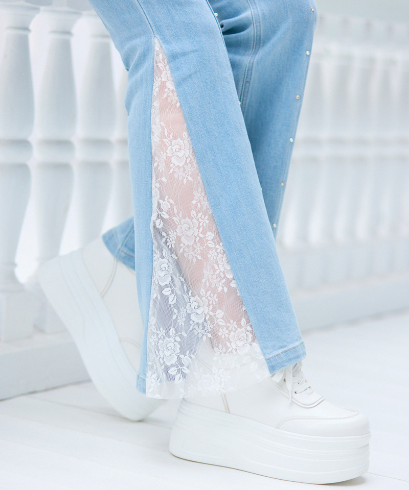 両サイドのスリット部分から覗く繊細なフラワーレースが女性らしさと大人の抜け感を演出してくれます。