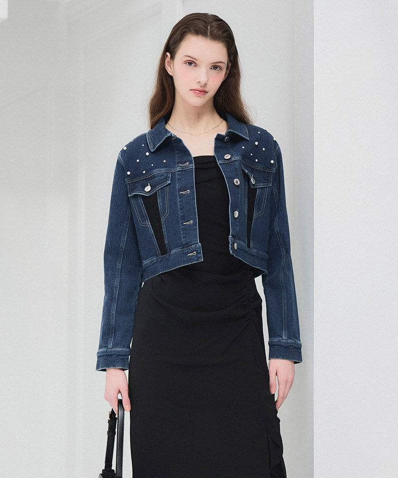 胸元の上品に煌めくパール&ビジューがアクセントとなり目を惹くデニムジャケット。