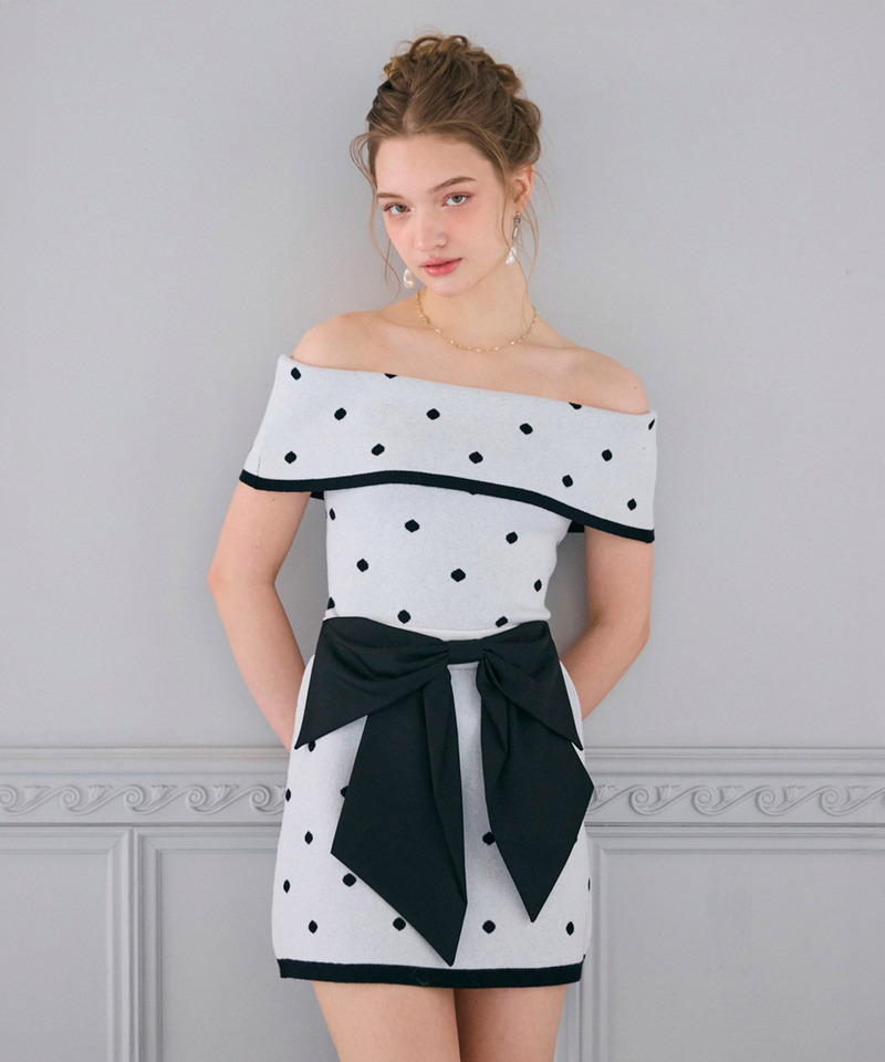 繊細なドット柄ジャガードが表情豊かで、オフショルで肩周りをすっきり見せることで大人っぽさをプラス。