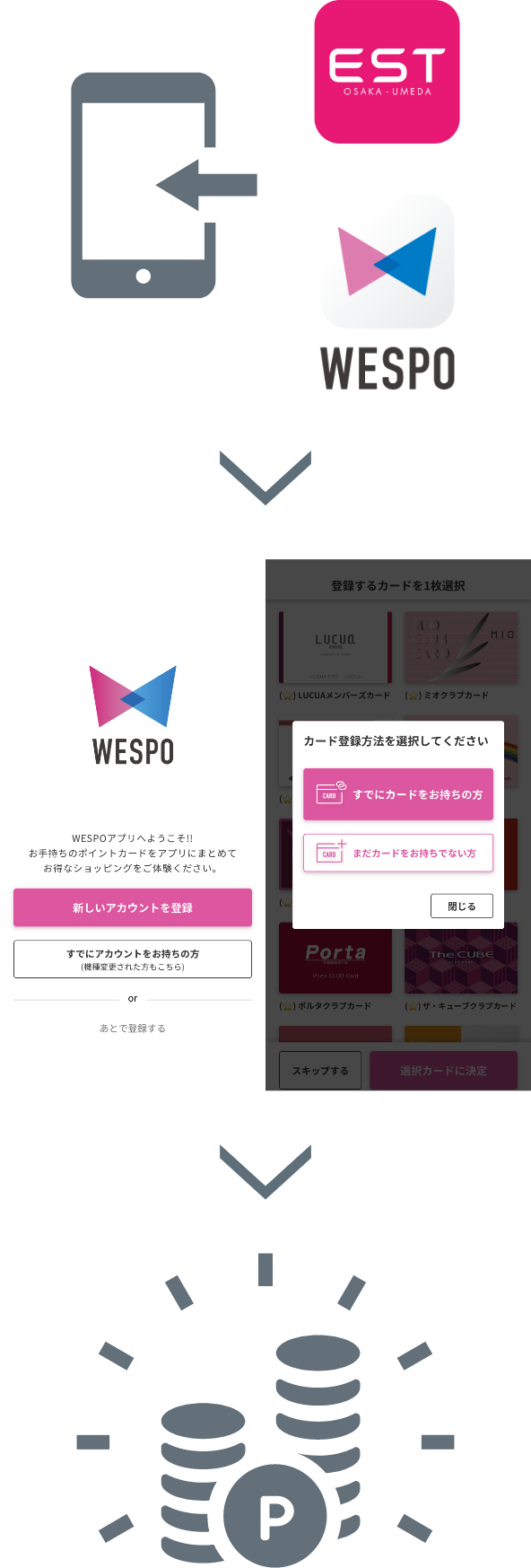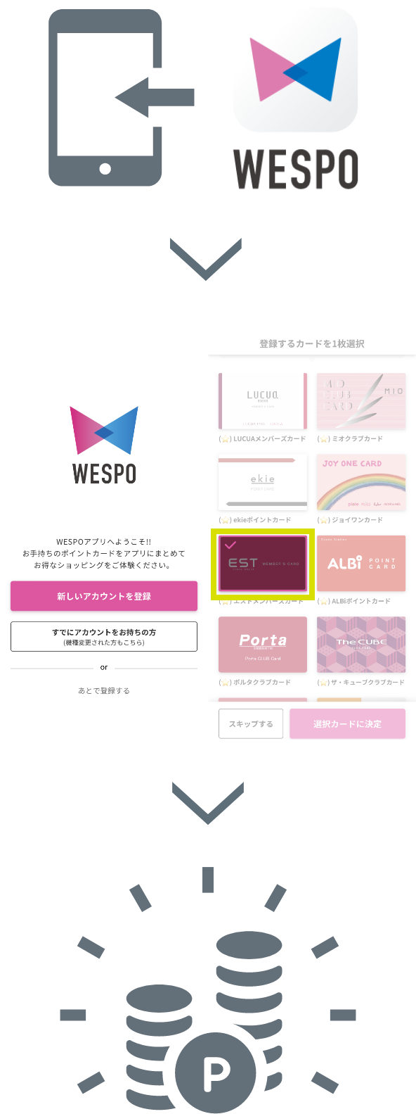 3/4~21の期間中にWESPOアプリを新規ダウンロードしてエストデジタルカードへ会員情報を登録した場合、 エストから100ポイント、WESPOから200ポイント=300ポイントがもらえる!