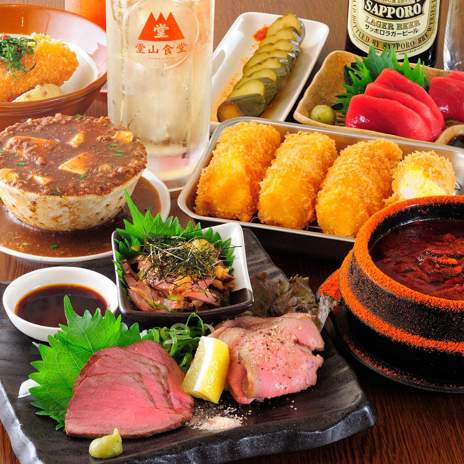 名物ハムカツやこぼし麻婆豆腐をはじめ、定番から季節変わりのメニューまで存分に楽しめます。ランチ、昼飲み、宴会などさまざまなシーンでご利用ください。