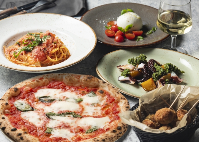 薪窯で焼く本格ナポリピッツァをはじめ、淡路島小麦の生パスタや、産地直送の旬野菜を使用したトラットリアメニュー、カフェタイムは焼きたてのワッフルなどが楽しめる。