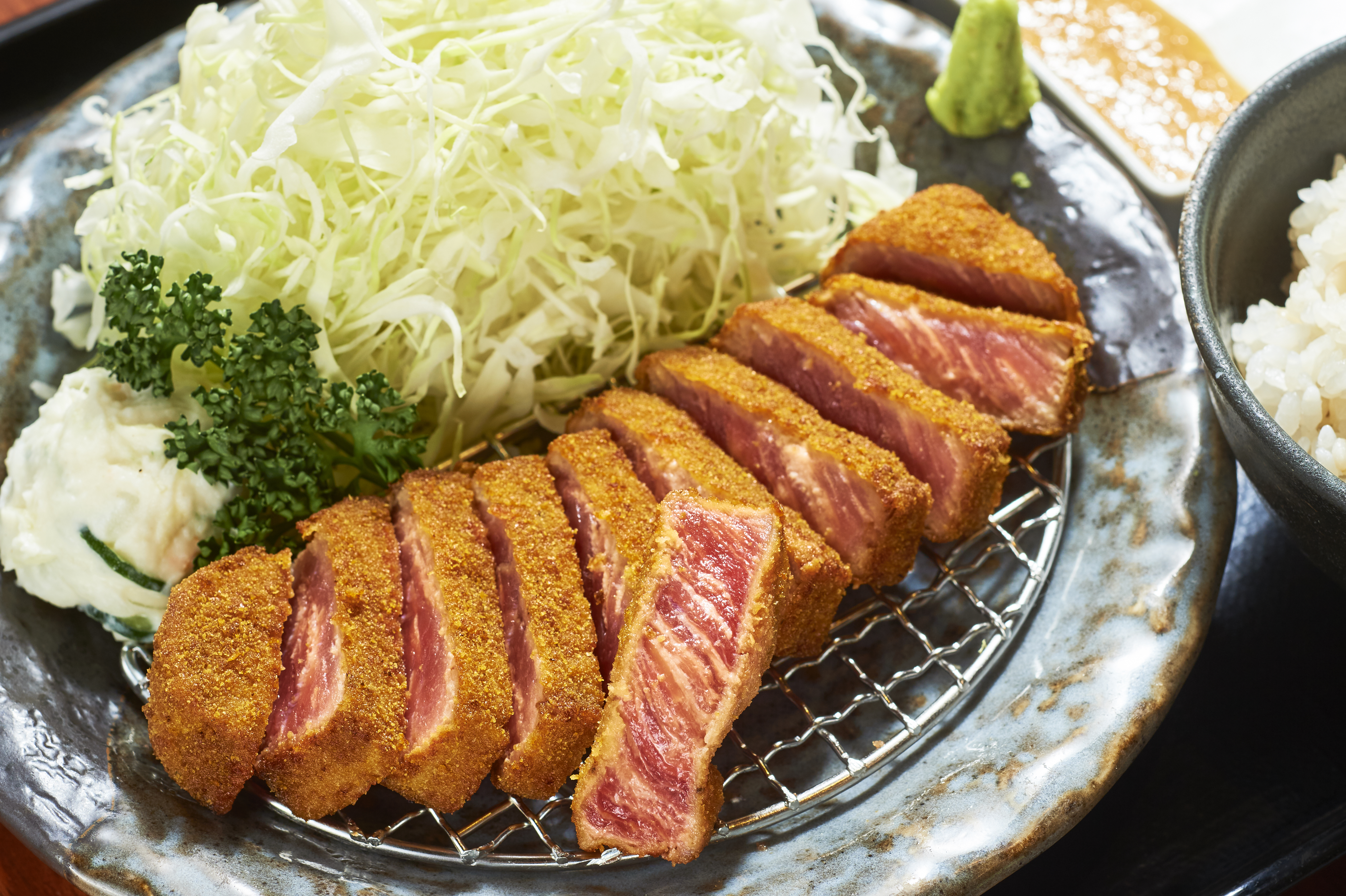 「牛かつを日本の食文化にする」という想いを胸に、ミディアムレアに揚げた牛かつを石板で炙り提供する専門店。落ち着いた和の空間で感じる、牛かつを石板で焼く音とふくよかな香り、贅沢な味わいをぜひご堪能ください。