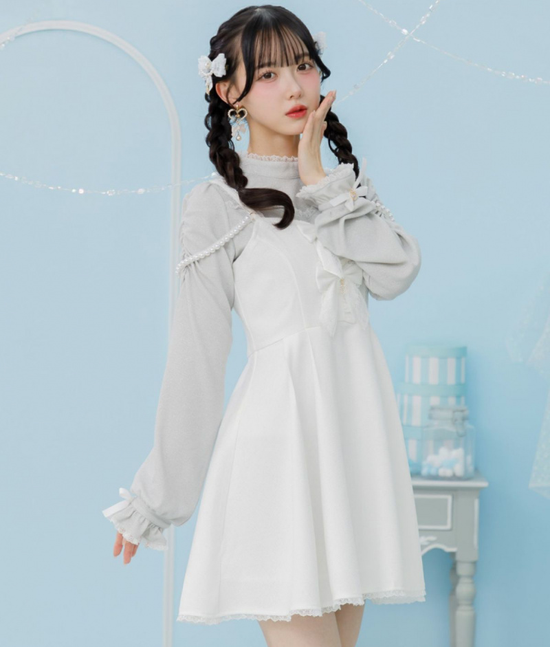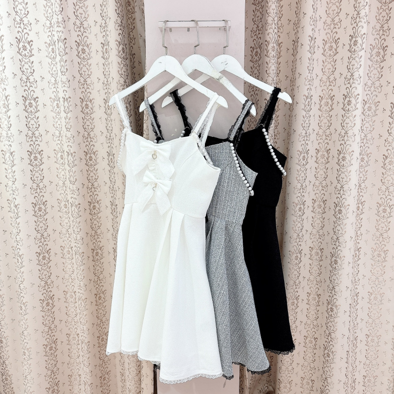 リボンブローチ付き♡重ね着が楽しめるジャンスカのお目見えです。パールの肩紐は垂らしてオフショルにもできるので、違った表情をお楽しみいただけます♪清楚なホワイト、シックなブラック、両立したグレーの3食展開。