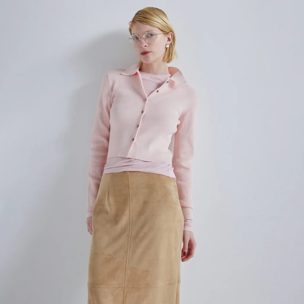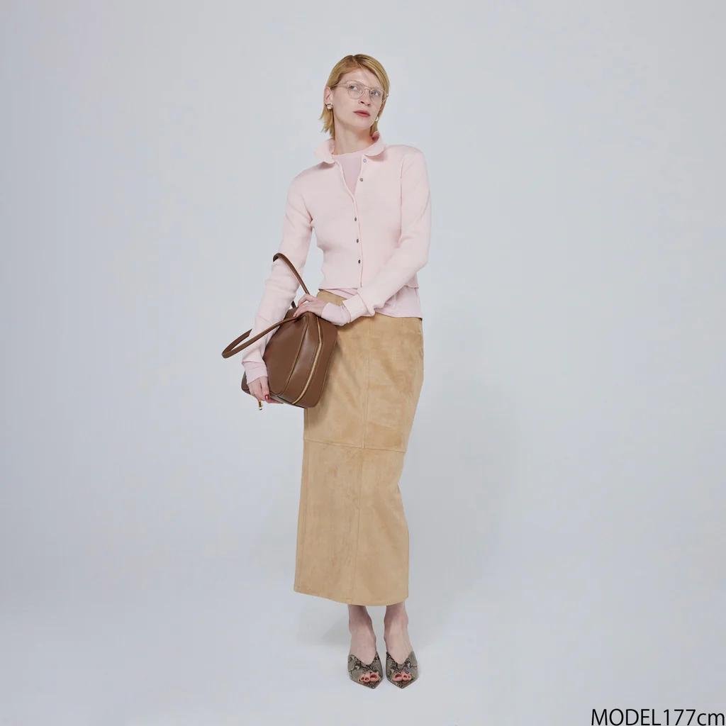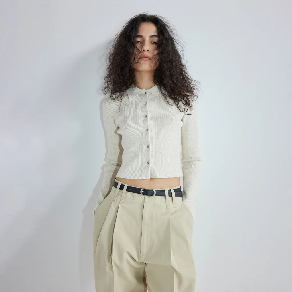 コンパクトなボディに、細身のスリーブでスッキリ。着丈を短めにすることで、ワンピースやロングスカート、ハイウエストボトムにも合わせやすいバランス感となっています。