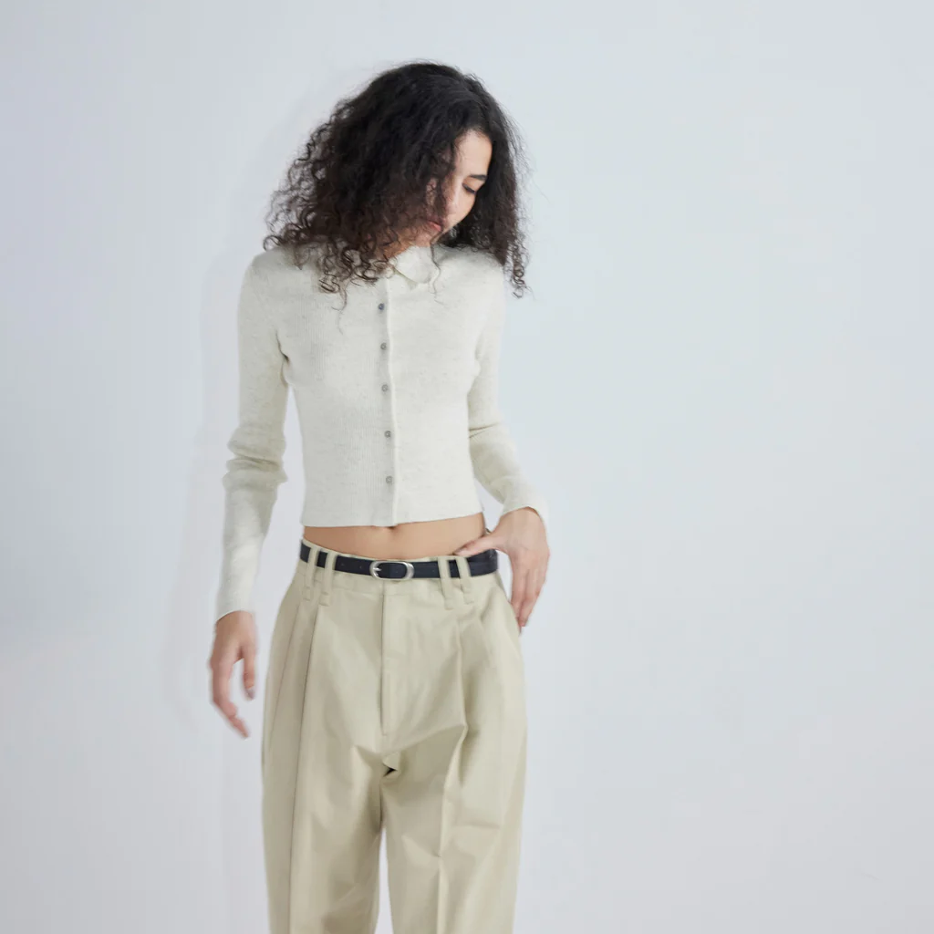 人気の〈リネンコンビ〉シリーズから襟付きのコンパクトなカーディガンが登場。スッキリとシームレスなデザインがポイントに。ずっと使えるベーシックさも魅力。