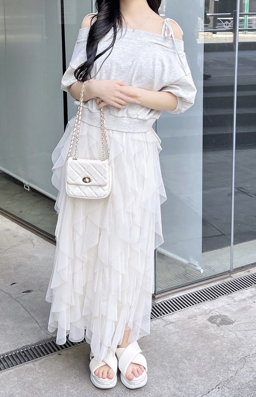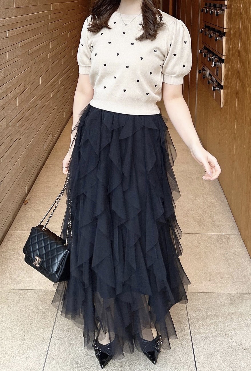 こちらのアイテムは、大きな花びらのようなフリルチュールが印象的なロングスカートです🌸🍃