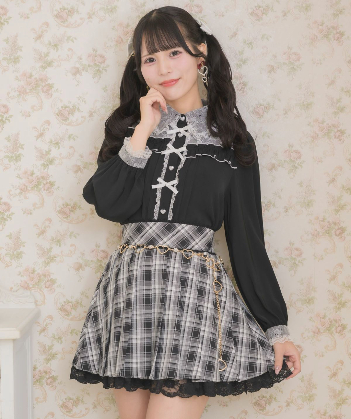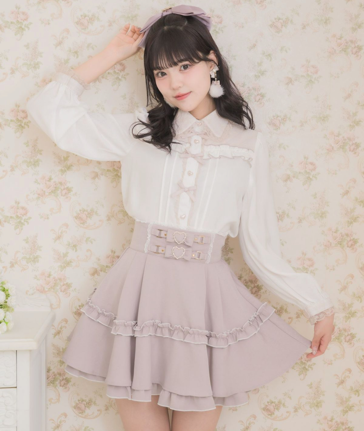 衿とヨークのレース使いが華やかに着飾るブラウスのお目見えです。ロマンティックなハート釦との間にリボンを並べ、ピンタックが縦のラインを強調しスタイルアップを促します♪レースとディテールの色味を揃えたことでスタイリングしやすく設計♡淡い色味のバランスが好印象なアイテムです。