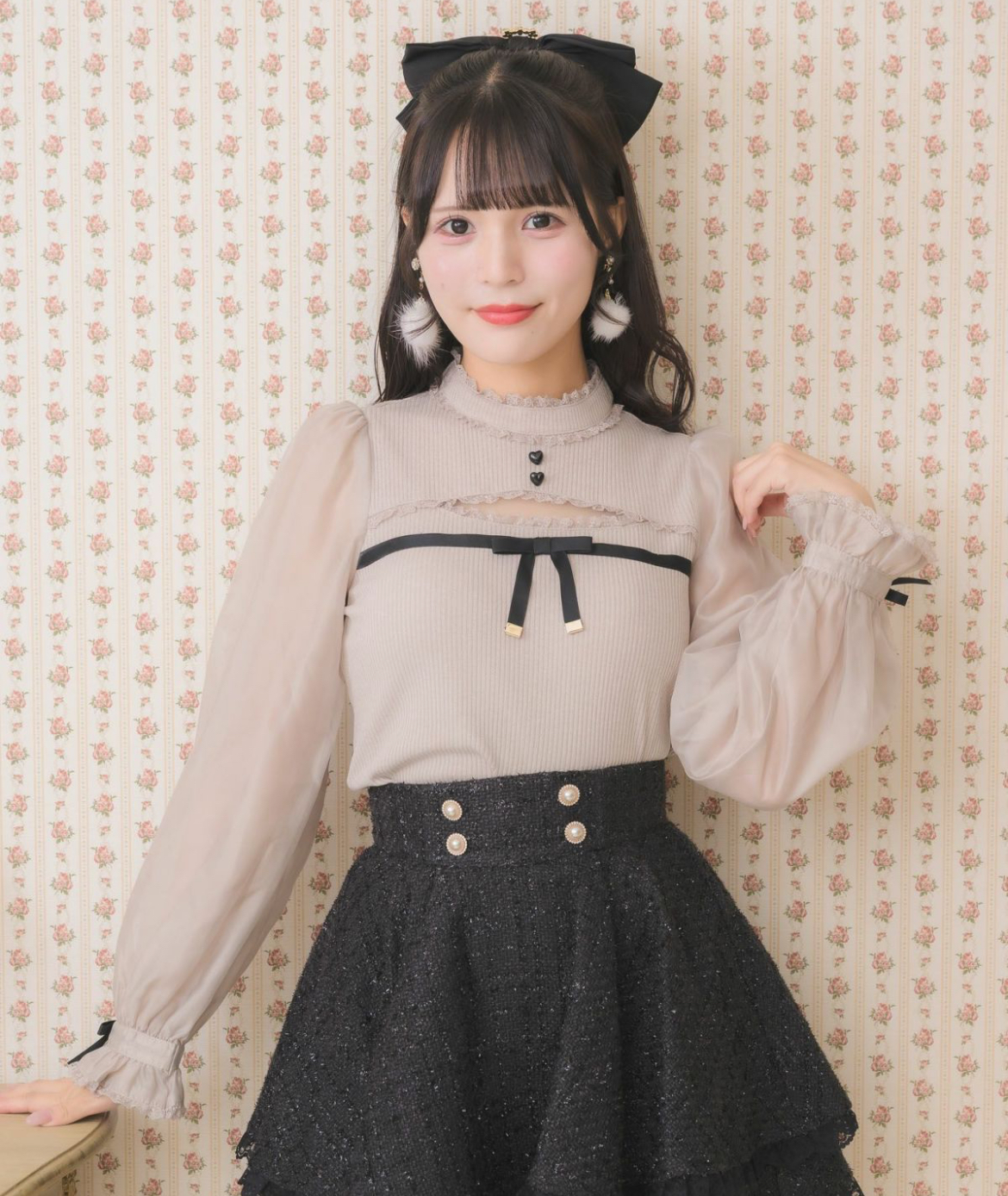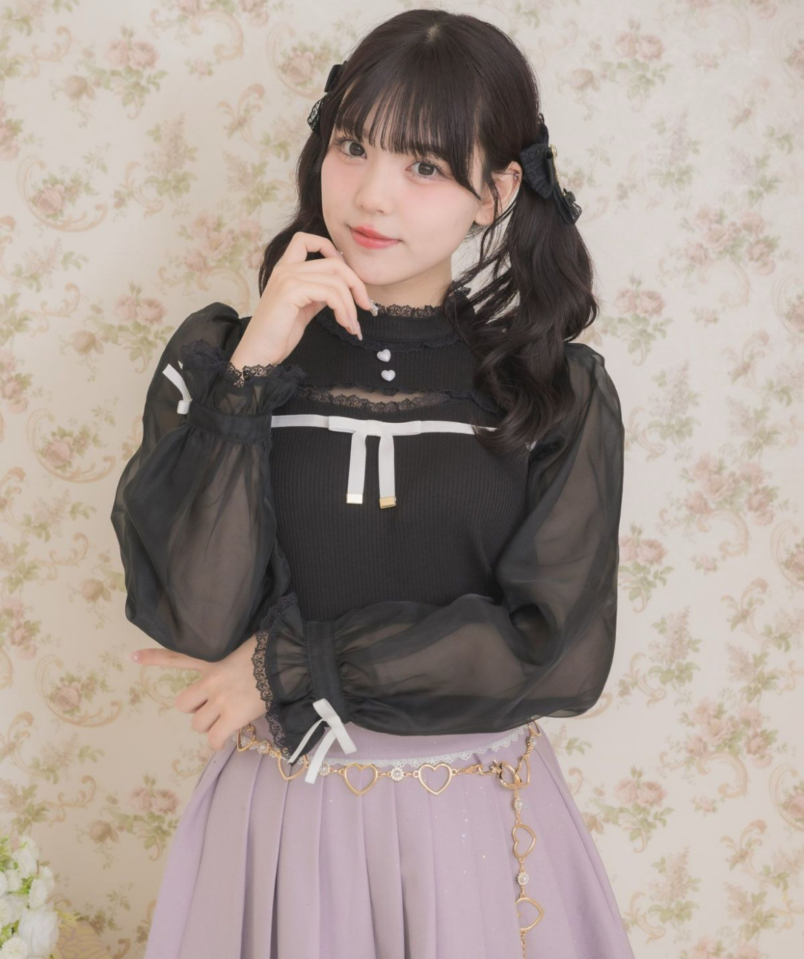 季節の変わり目&インナーとしても合わせやすい薄手のトップス♡控えめな肌見せとシアーの透け感がマッチしておしゃれ上級者に磨きをかけます。テープリボンがアクセントになり、バランスよくメリハリをプラス◎コロンとしたハート釦で甘いニュアンスを加速させます。