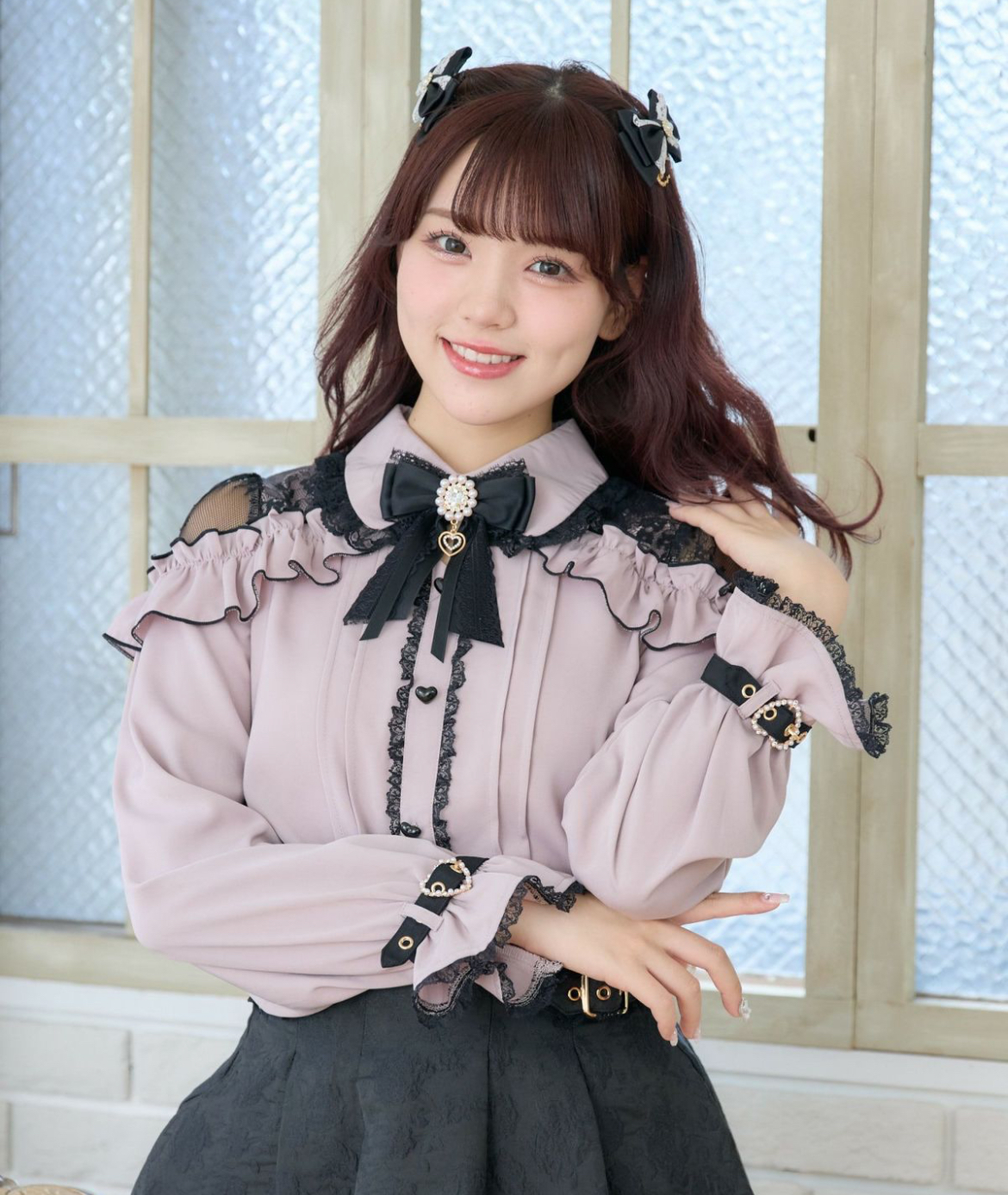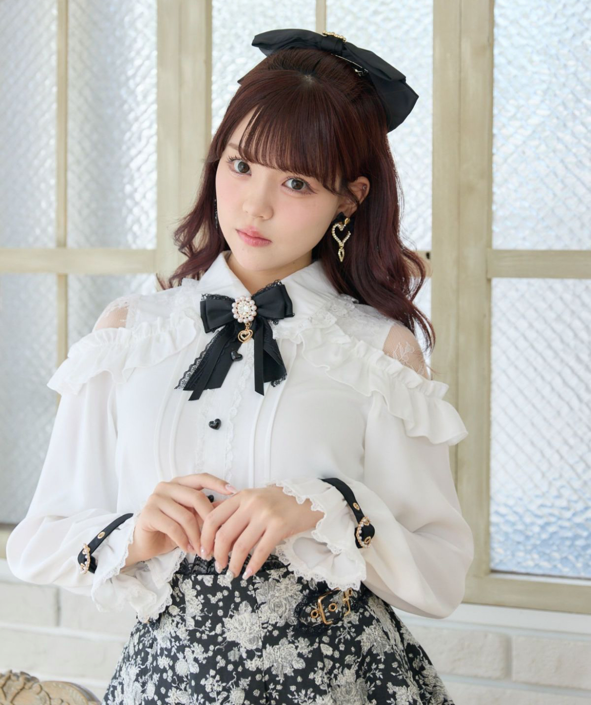 メローフリルがコーディネートを華やかに彩り、ショルダーに施されたレースが抜け感を演出するブラウス。ハート形の釦など、細部まで可愛さにこだわっているのもポイント◎袖口のベルトは地雷要素をプラスしてくれ、きゅっと絞った手元もお洒落映えすること間違いなし♪