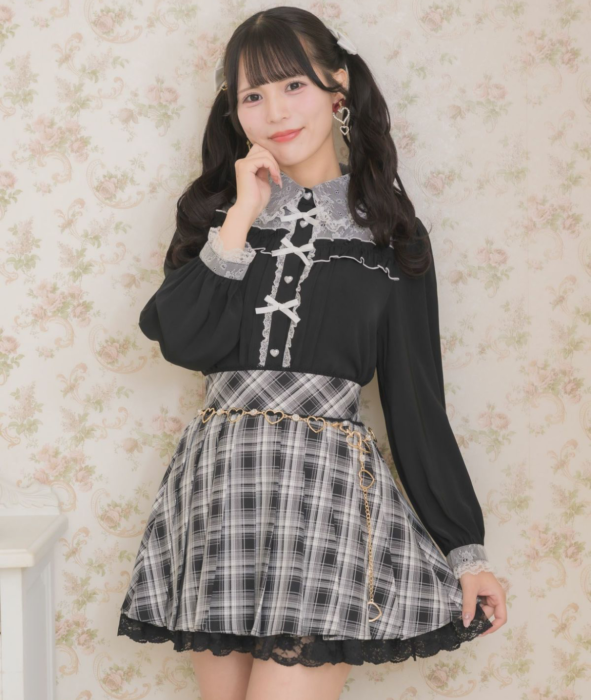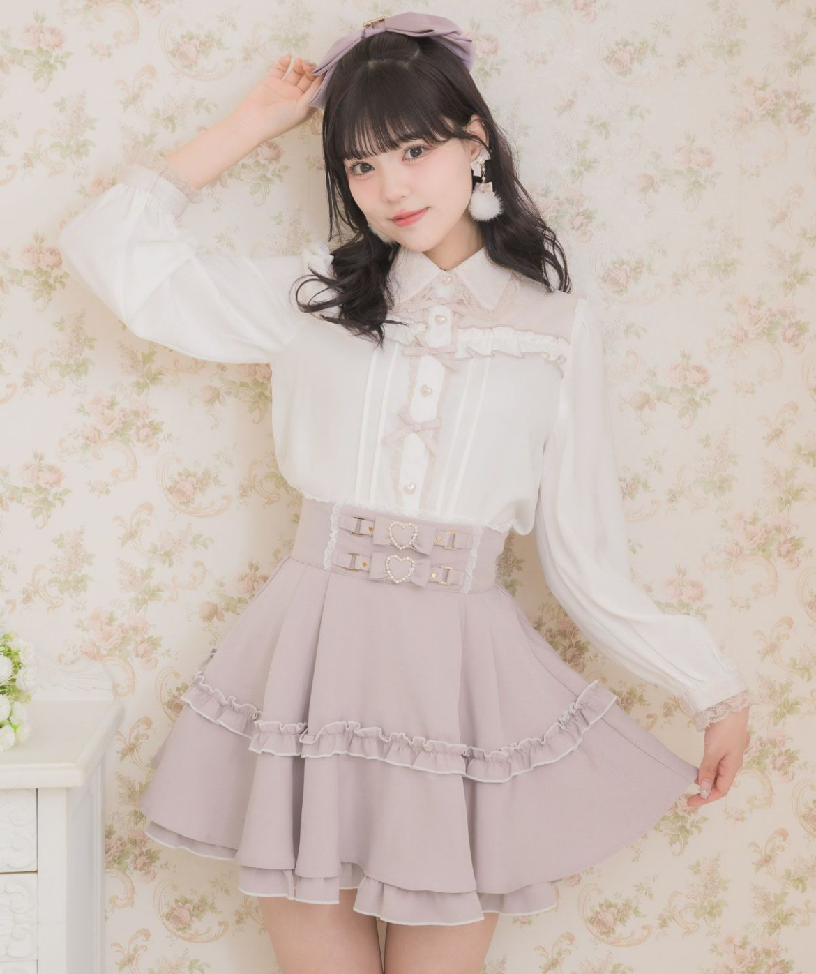 衿とヨークのレース使いが華やかに着飾るブラウスのお目見えです。ロマンティックなハート釦との間にリボンを並べ、ピンタックが縦のラインを強調しスタイルアップを促します♪レースとディテールの色味を揃えたことでスタイリングしやすく設計♡淡い色味のバランスが好印象なアイテムです。
