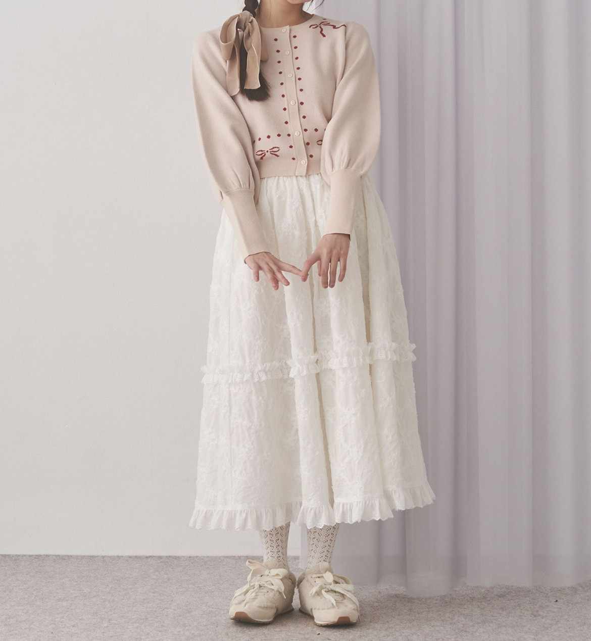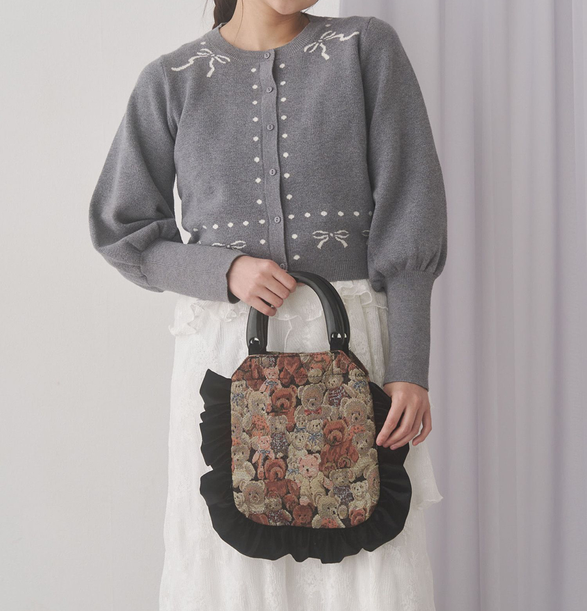 並んだリボンとさりげないドットがアクセントになったコンパクトシルエットなニットカーディガン。