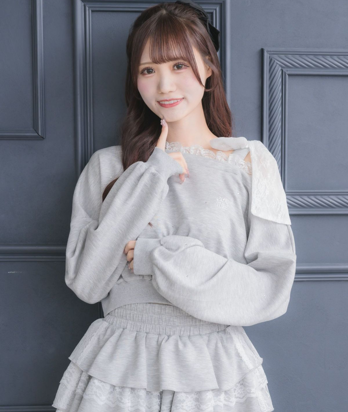 カジュアルだけどお洒落映えできるスウェットトップス。ランダムなストーンが全体的に施されていて光の具合でキラキラと表情をプラスします。ワンショルはインナーのストラップを隠しやすい幅感、レースリボンがお顔まわりの可愛いアクセントになってくれます。ボトムもスウェットアイテムと合わせるとセットアップ風に着用いただけます。