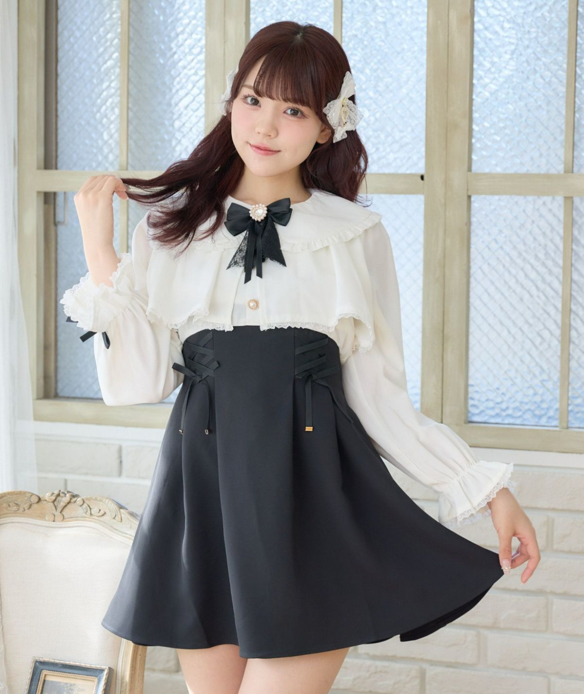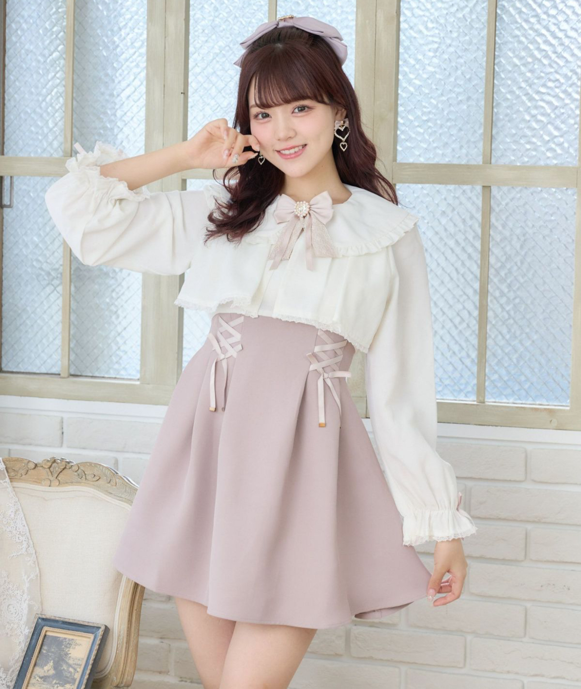 特徴的なヨークフレアが目を惹くデザイン♡新鮮なムードのなかで、レースアップが女の子らしい甘い雰囲気をプラスします。ウエストを細見えしてくれる設計で好バランス◎丸襟とハートのビジュ付きリボンがガーリーニュアンスを加速します。