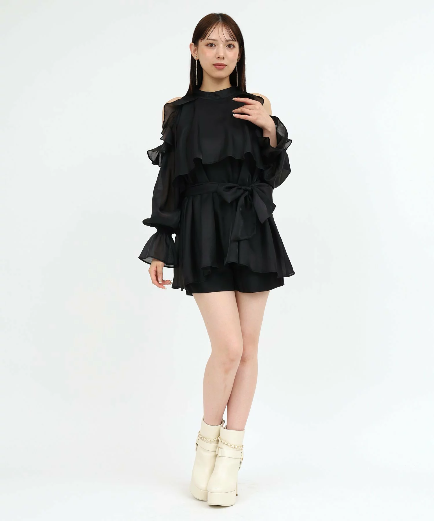 リボン付コールドショルダー長袖ブラウスセットアップ