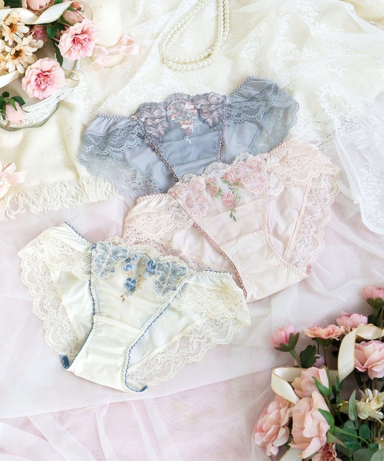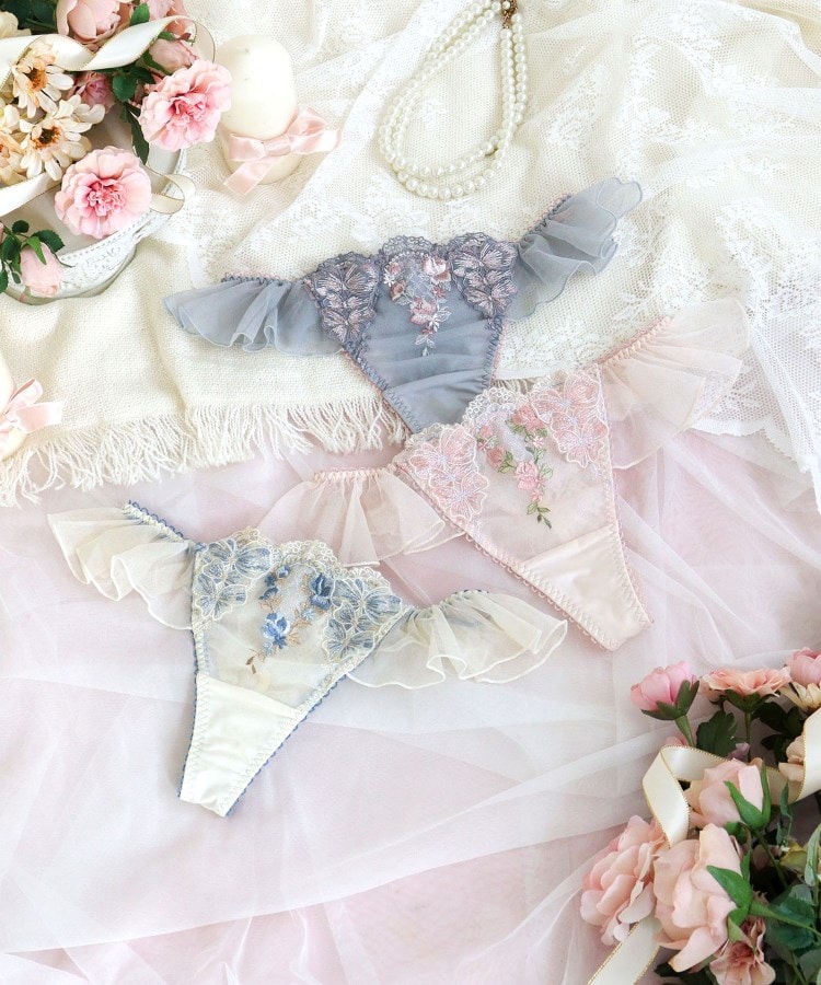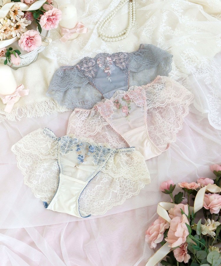 フランスのロココ様式の装飾をふんだんにあしらった、ドレスをモチーフにしたシリーズです。レースにはリボンの編み上げデザインや、可憐に咲く花々をあしらい、お花は密度のあるステッチで立体的に。サイドには小さなリボンを添えて、甘い可愛らしさをプラスしました。全体にキラキラと輝くラメ糸をほどこした、思わず心ときめくロマンティックなデザインです。