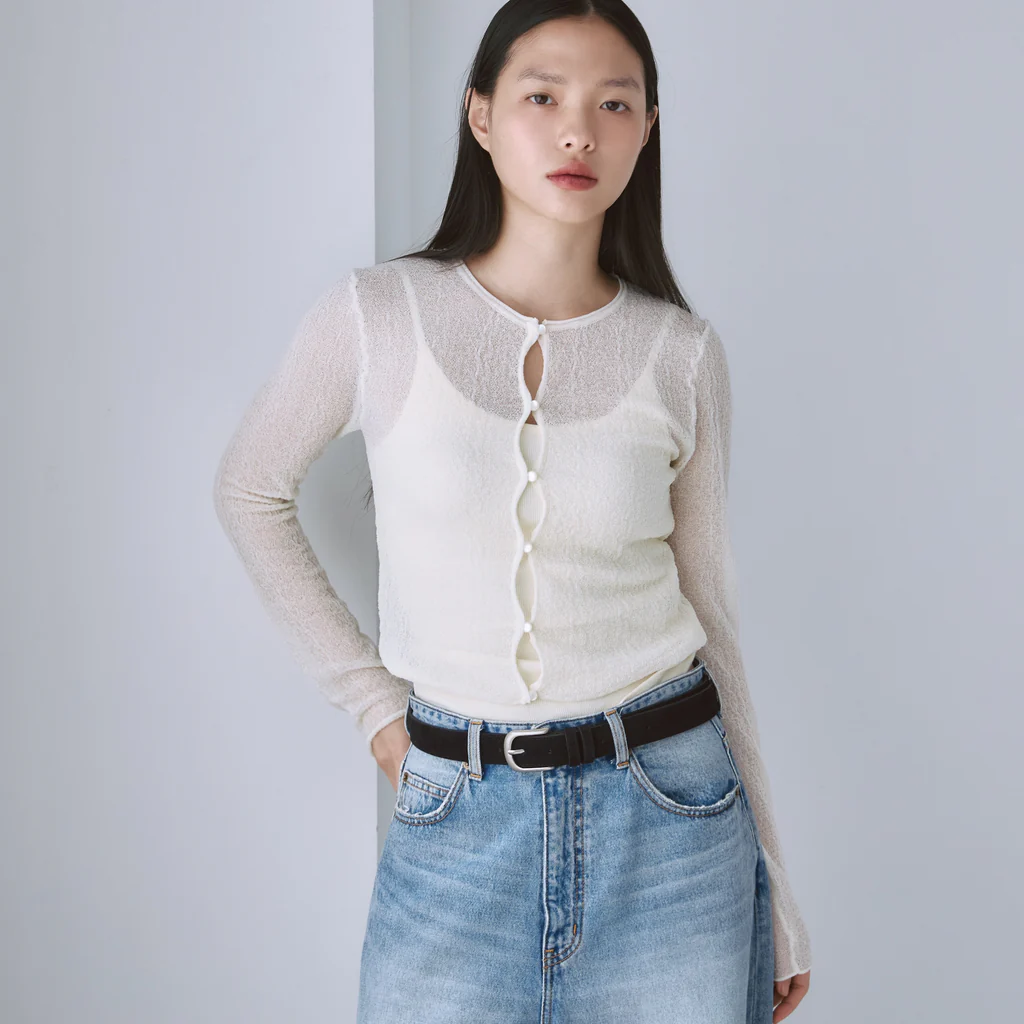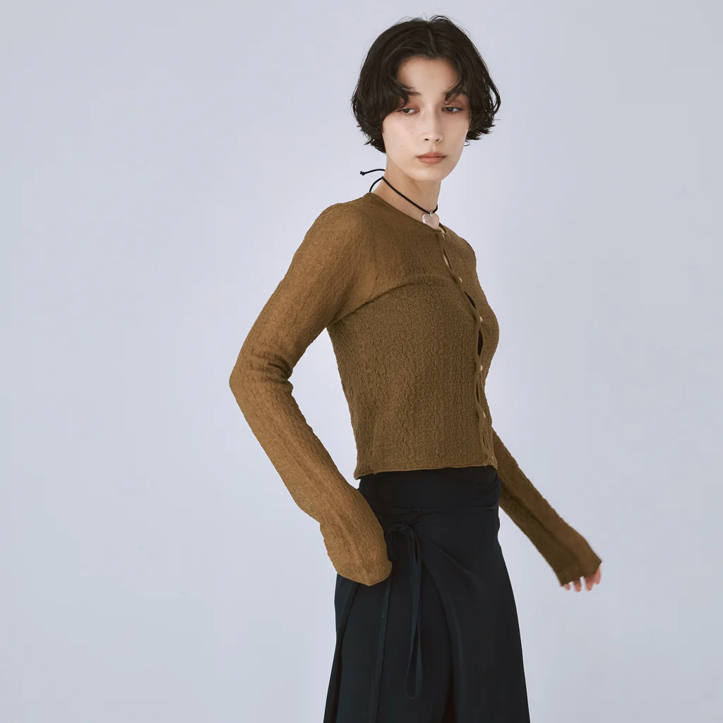 軽やかなニット素材で編まれた、凹凸感が可愛いカーディガン。合わせやすいコンパクトさが魅力です。フロントの涙型ホールが、クラシックで女性らしいアクセントを添えます。