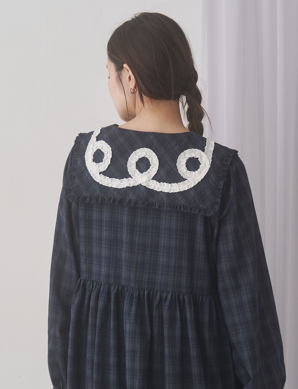 大きな襟にくるくるフリルを施した秋らしいチェックのワンピース。