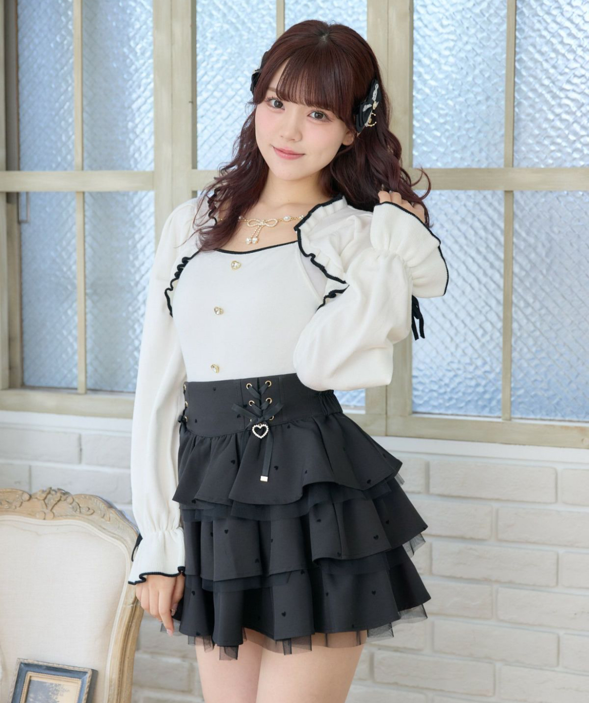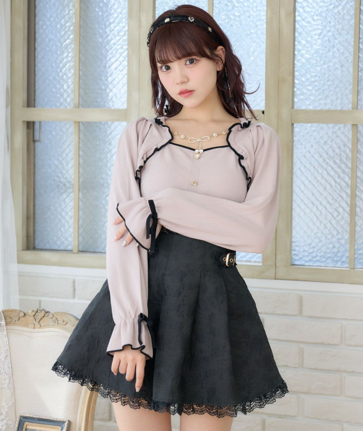 重ね着いらずのドッキングデザイン♡デコルテのリボンチェーンがリュクスなクラス感を演出、シーズンライクなニットがモードを加速させます。配色メローがメリハリをつけてくれ、袖元のリボンが女の子らしさをアップデート♪ミニボトムを合わせるとよりガーリーに◎
