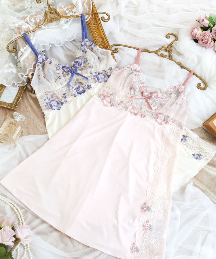 バラのお花と扇形模様を組み合わせた、豪華でエレガントなシリーズです。レース全体に咲きほこる大輪のバラは、大胆なカラーリングでインパクトを持たせつつも、女性らしい印象に。周りには様々な小花をあしらい、可愛らしさをプラスしました。扇状に描かれた模様は扇の線1つ1つに変化をつけ、2色のラメ糸をふんだんにほどこすことで、バラの存在感を引き立てたより一層の華やかさを演出します。身生地にはアシンメトリーなカッティングでストレッチレースを贅沢にあしらい、ポイントで小さなアップリケを散りばめて、360度どこから見ても特別感あふれるデザインに。豪華なエンブレースが生み出す調和が、身に着けるたび心をときめかせてくれるようなランジェリーに仕上がりました。