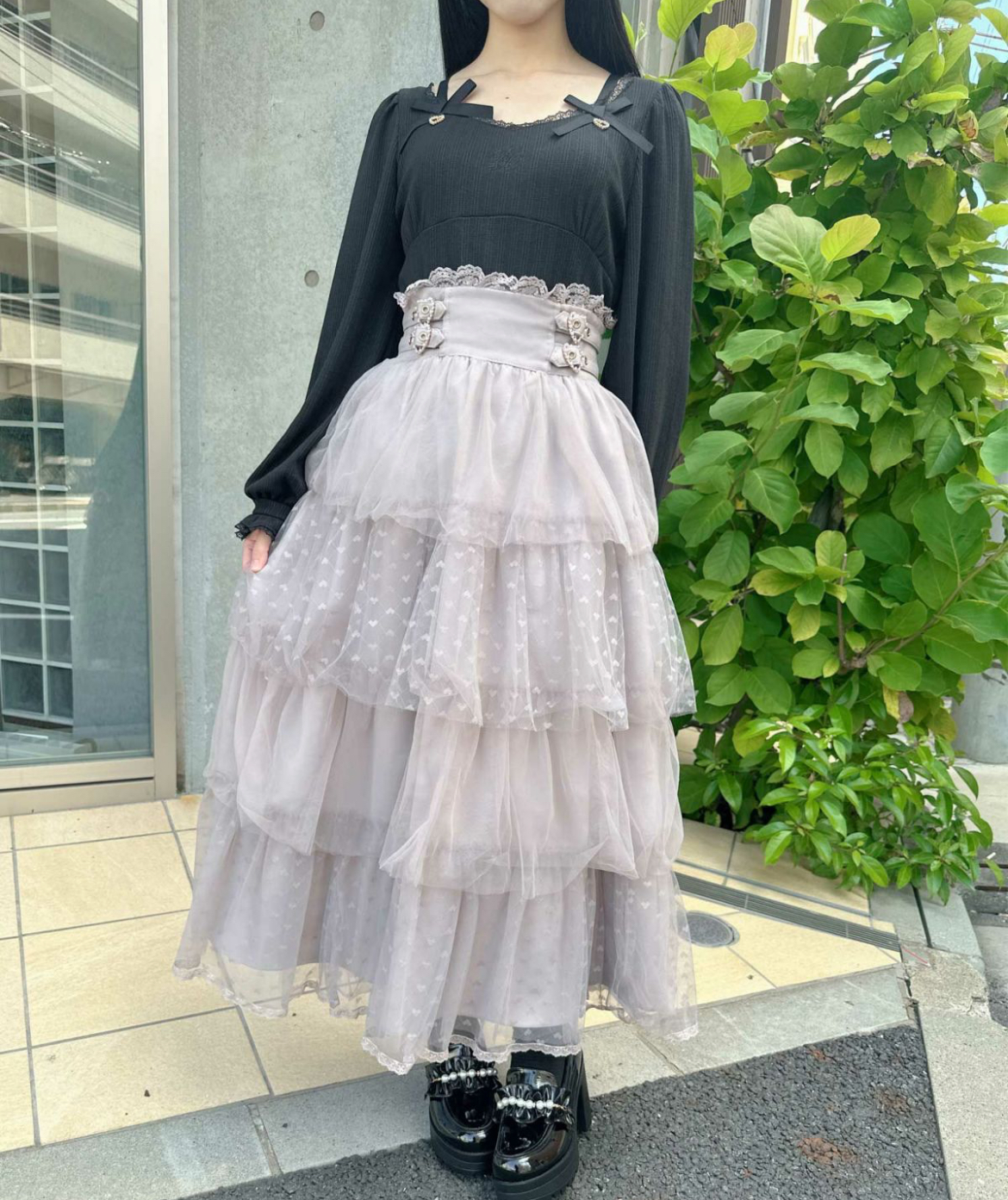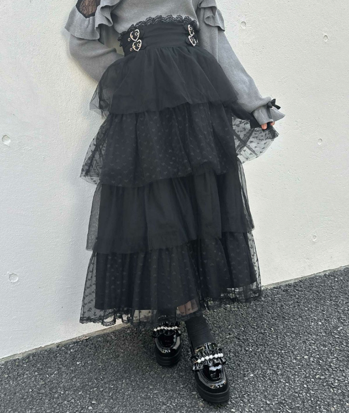 ハート柄×ふんわりチュールでガーリー全開♡甘さと存在感を兼ね備え、歩くたびに揺れるティアードが乙女心を擽ります♪ウエスト部分は太めのデザインで美シルエットを叶えつつ、ハートのバックルがキラキラとアクセントに光ります。