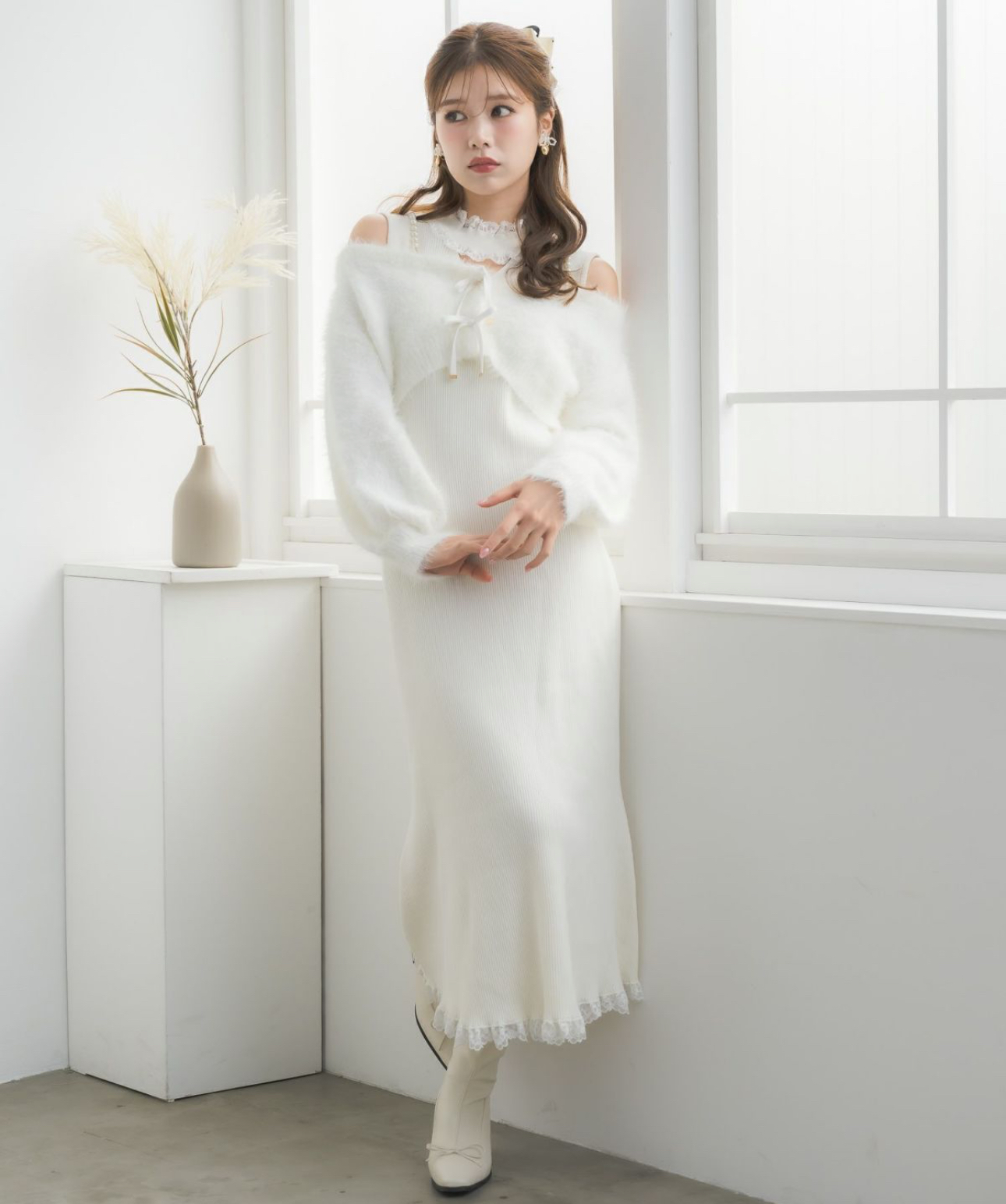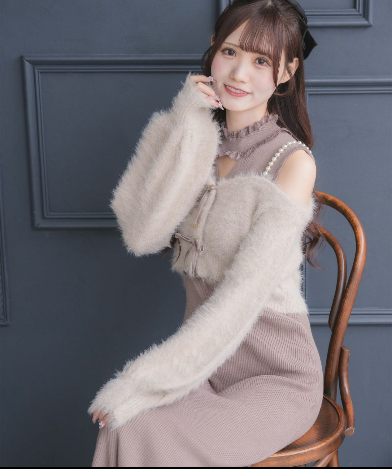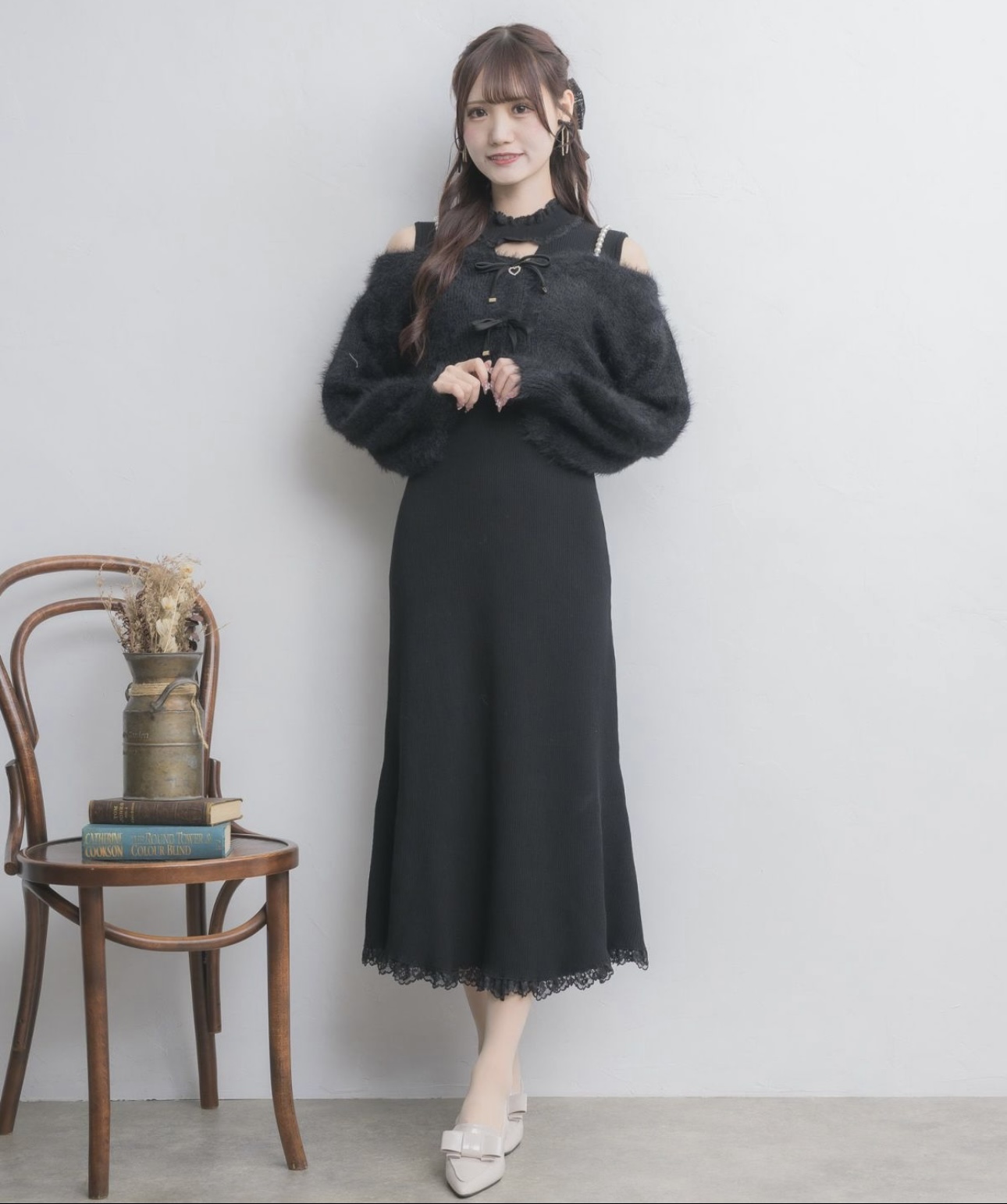 カーデとノースリーブワンピースのセットアイテム。タイトなロングワンピースがあざと可愛さ演出し、ふわふわのフェザーニットがつい触りたくなるビジュアルで冬のコーデを盛り上げます♪ワンピースを主役にオトナレディなスタイルにまとめるのがおすすめです。