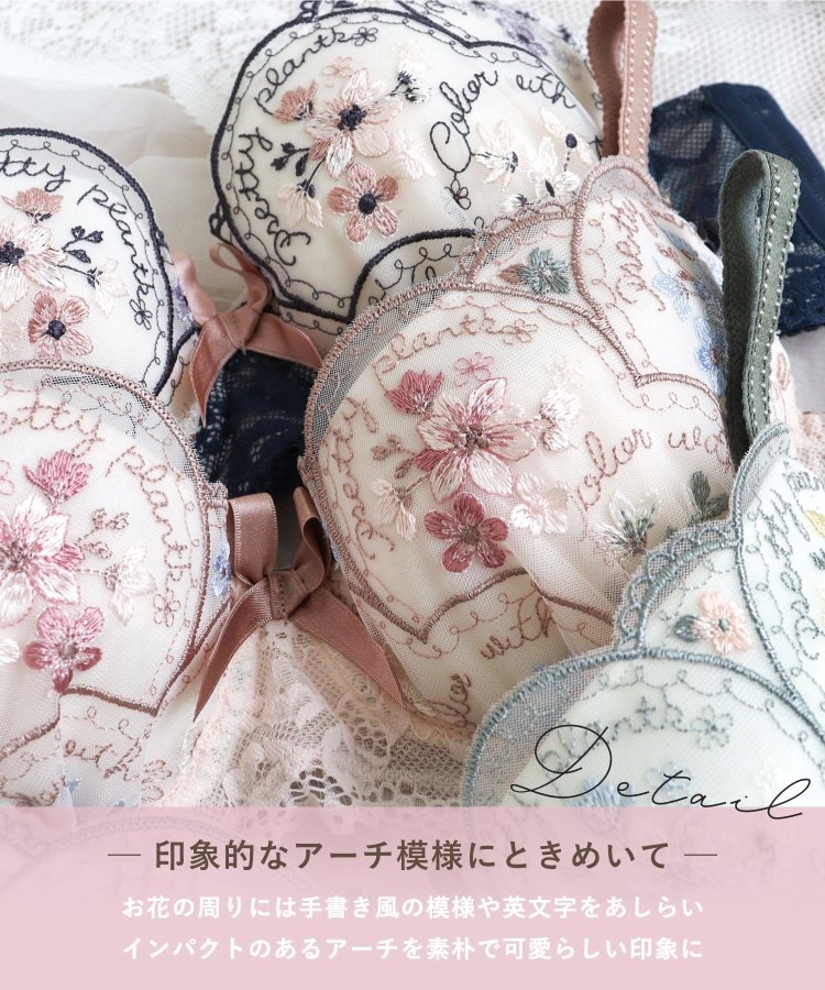 大きなアーチの中に小花や英文字を散りばめた、オリジナリティあふれるシリーズです。リサマリの象徴でもあるお花は、繊細なステッチで3色のグラデーションにすることで、花束のような華やかさを演出。その周りにはアーチに沿うように手描き風の幾何学模様や、Pretty plants、Color with flowerの英文字を入れて、インパクトのあるアーチを素朴で可愛らしい印象に仕上げました。両サイドには小花のアップリケをあしらい、レースの柄行を引き立てています。リサマリの遊び心とメッセージを詰め込んだコレクションをお楽しみください。