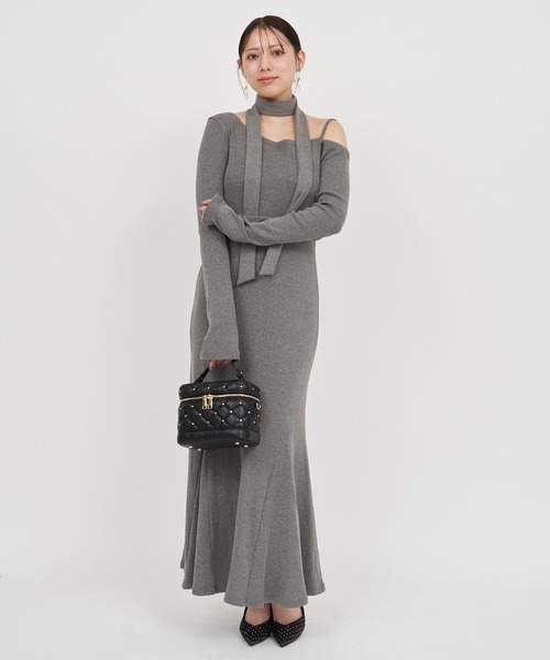 ストール付きのアシメネックが目を惹く、モードな表情のカットソーワンピース。