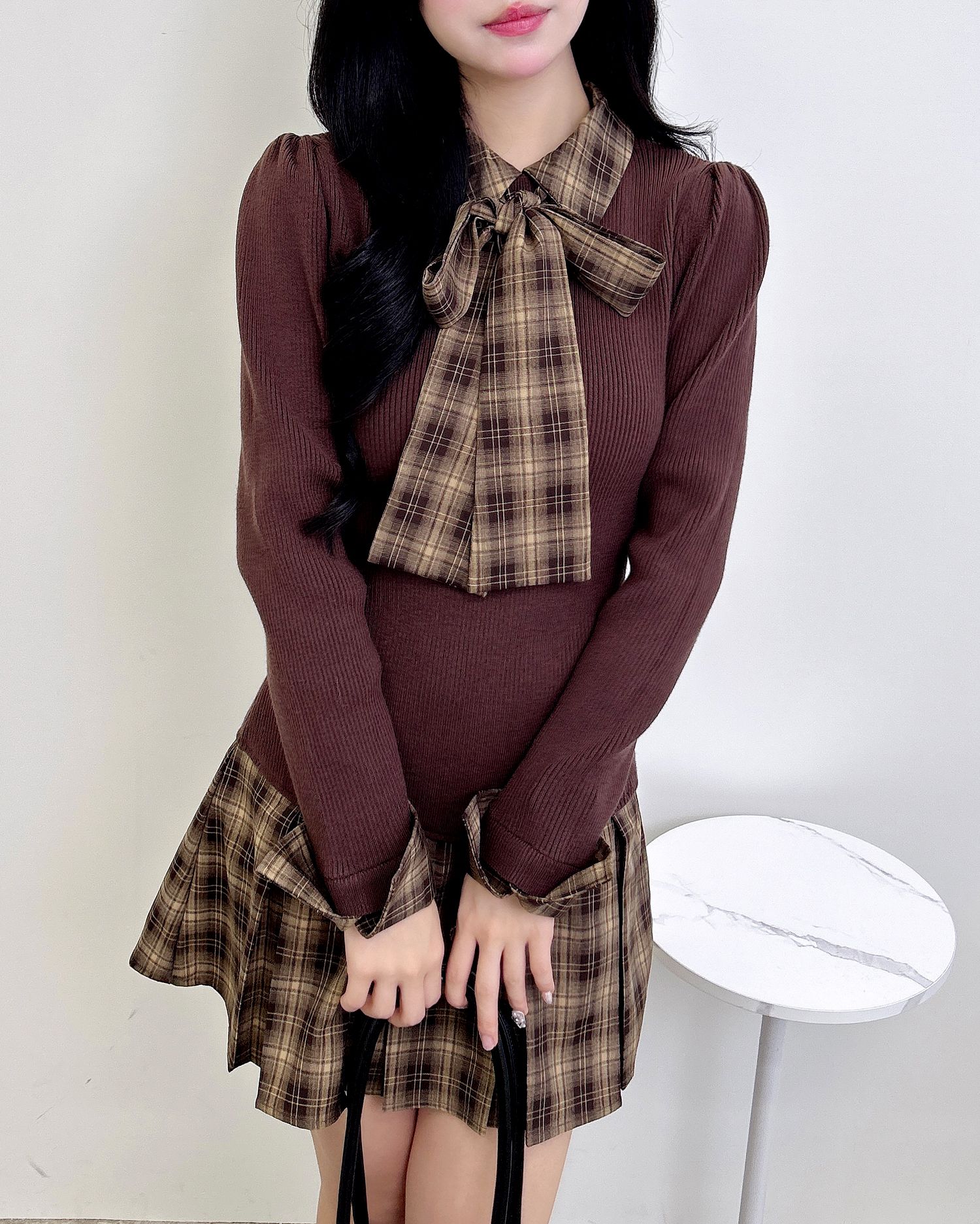 1254-500225 チェック柄ボウタイシャツドッキングニットワンピース