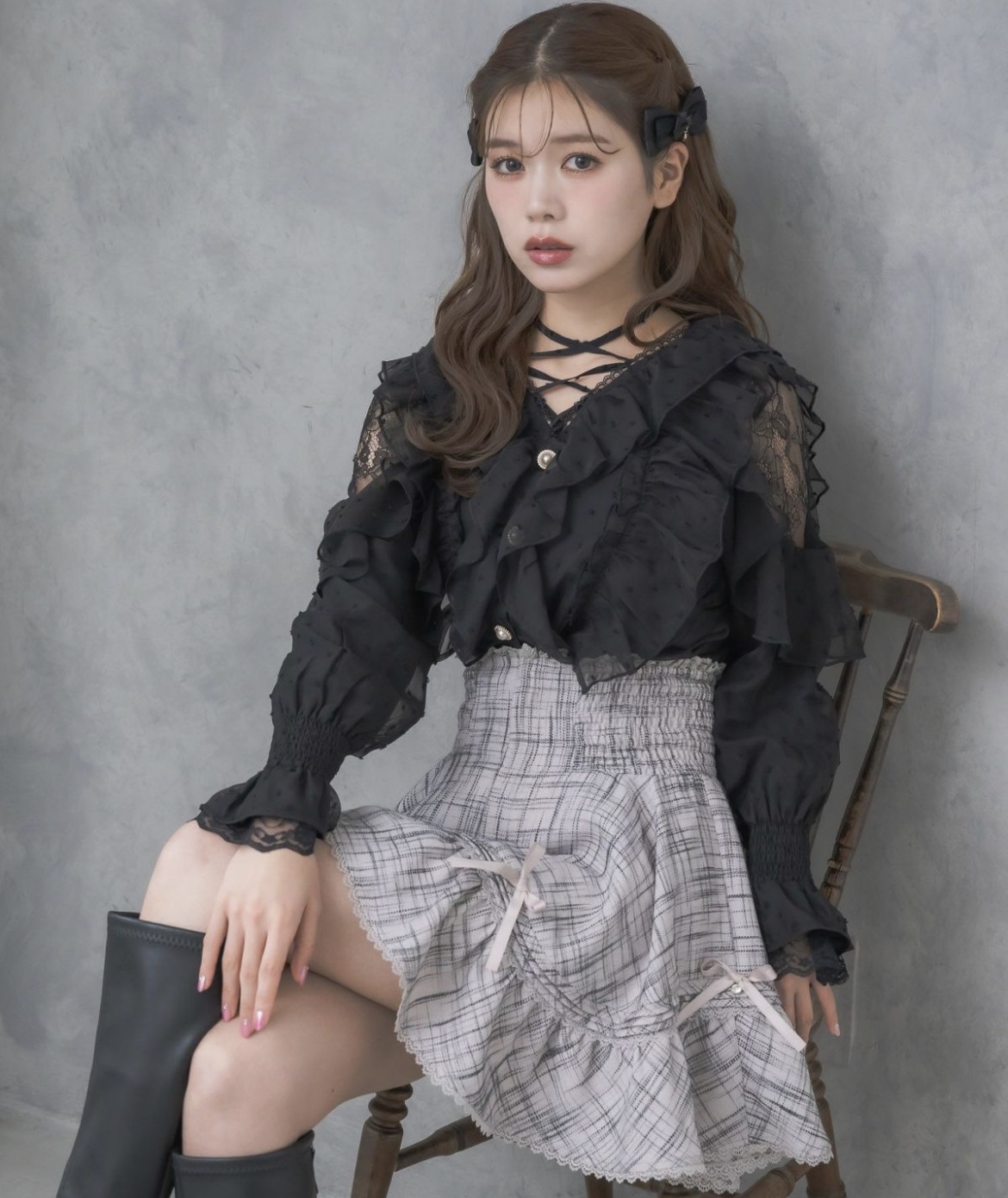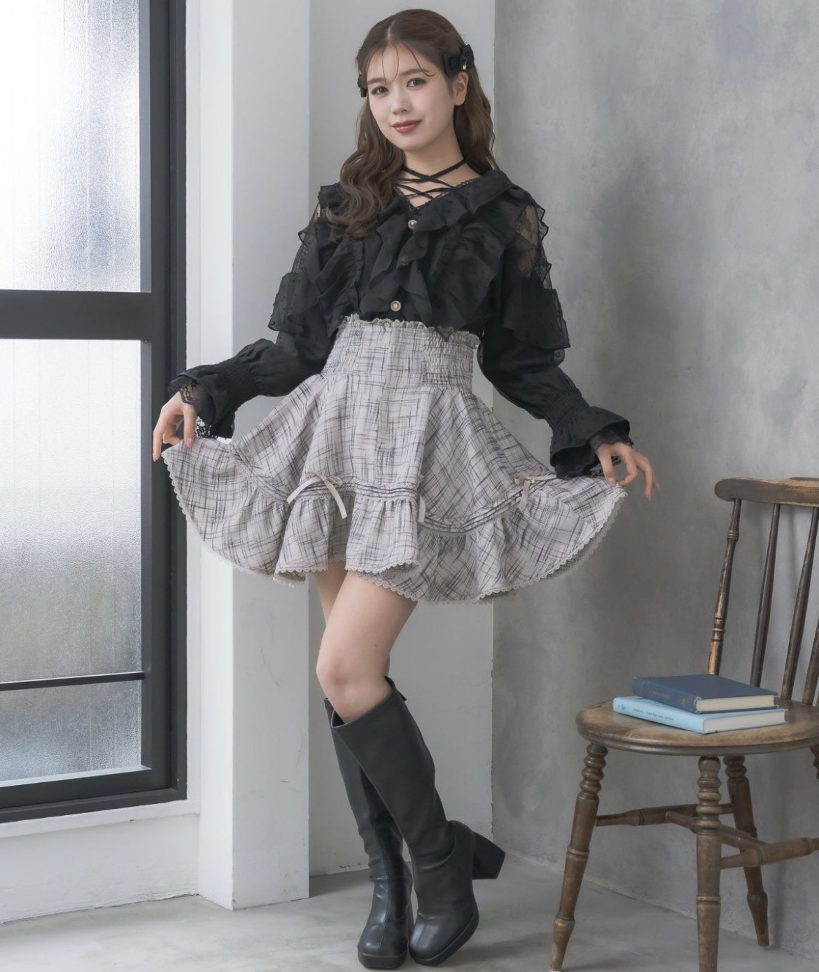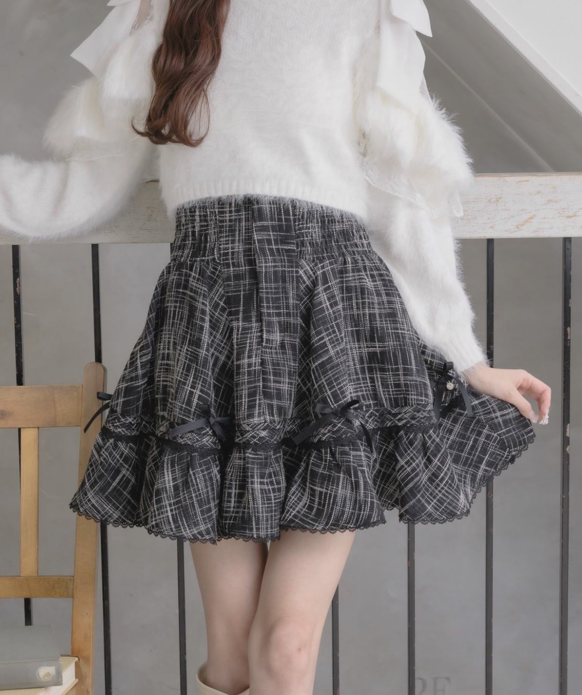 ウエストにたっぷりと施された太めのシャーリングが、しっかりフィットしてくれる安心感と細見え効果を両立。フロントのリボンは、ちょこんと甘く、視線を惹きつけるアクセントに◎裾にかけてふんわり広がるフレアラインが、動くたびに揺れて女の子らしさを最大限に引き立てます。
