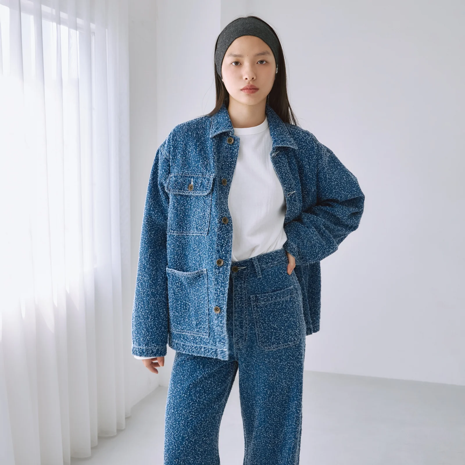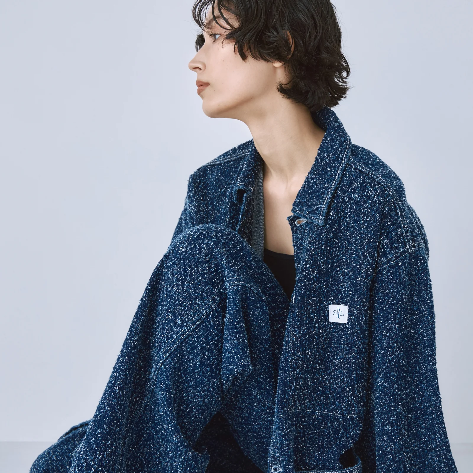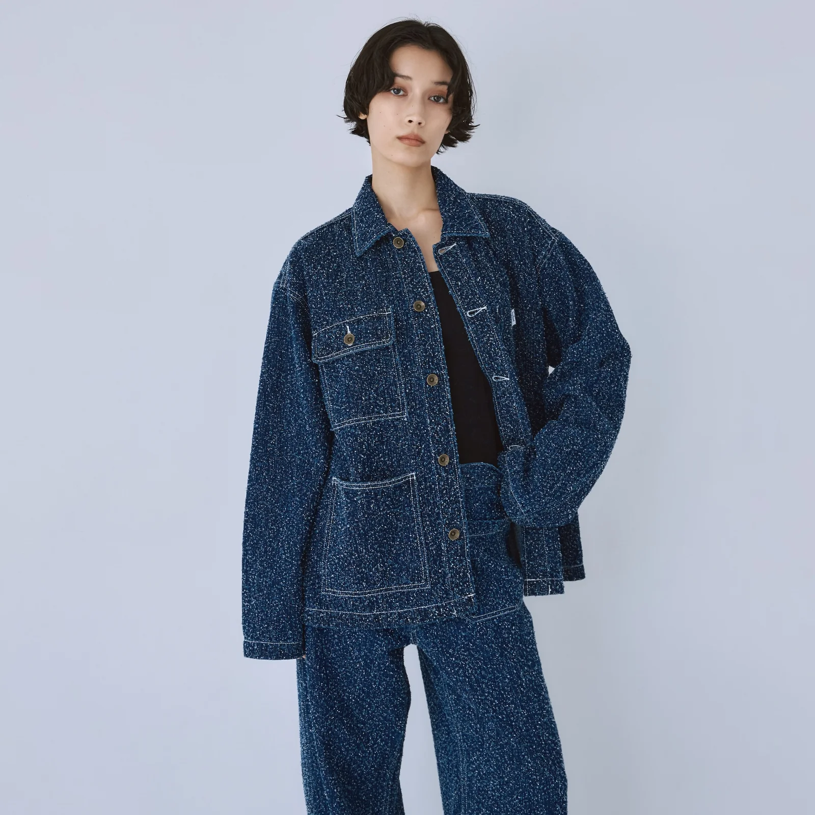12.5oz(オンス)のデニム生地に“ニードルパンチ”加工を施しました。専用の針により繊維が引き出され、立体感や起毛感が出る手法。表面に動きが加わり、ヴィンテージ感やクラフト感が増すのが特徴です。ふんわりと柔らかな手触りもポイントに。