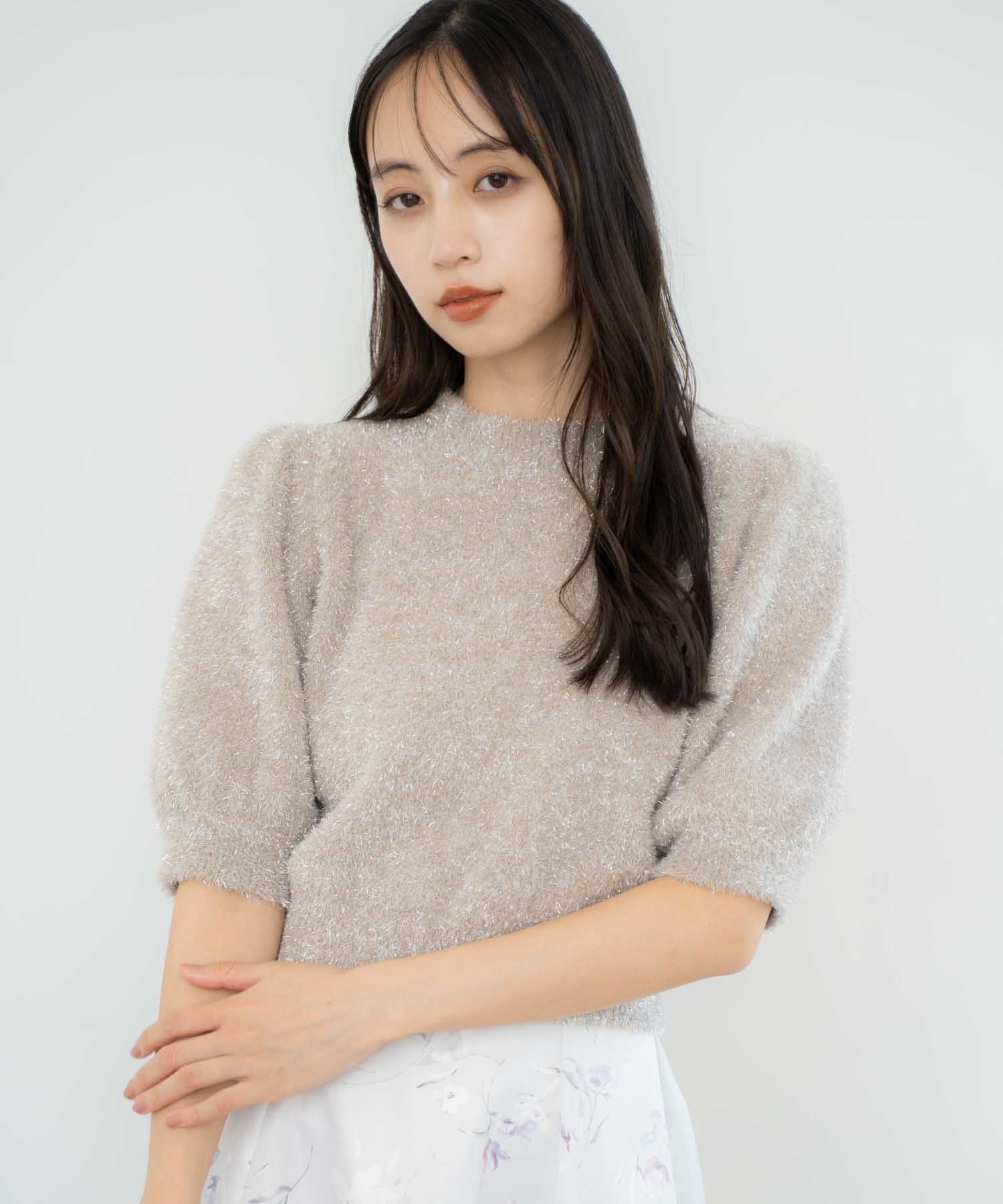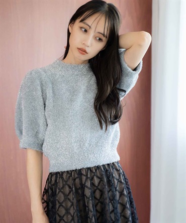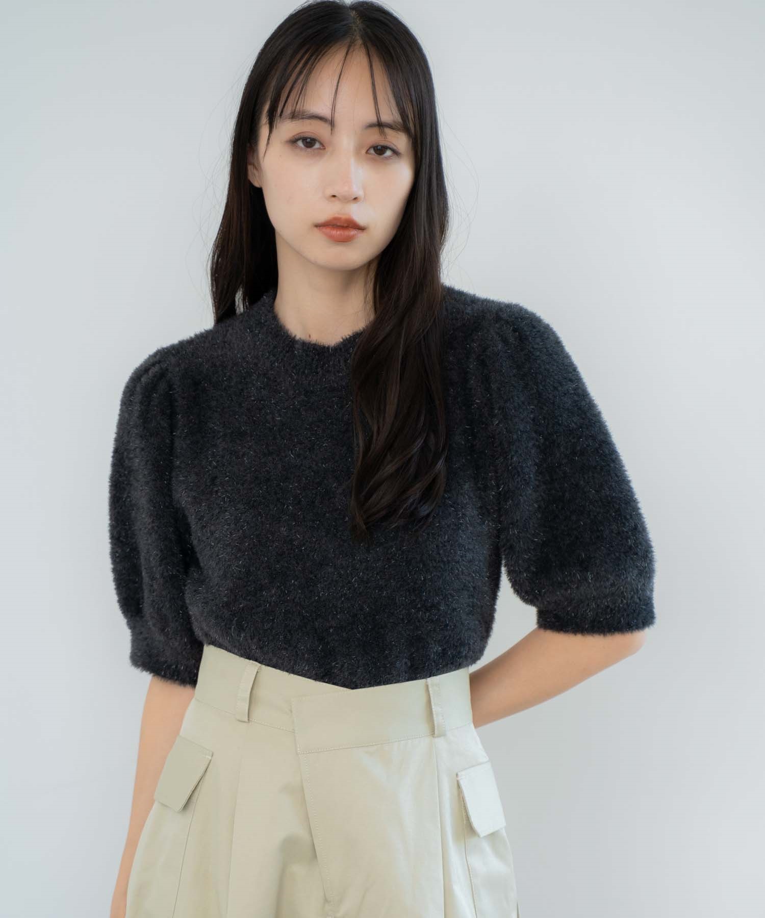 ラメ糸を引き揃えた華やかなシャギーニット。 パフスリーブとコンパクトな丈感で、1枚で主役になるデザインです。 ふんわり柔らかな肌触りも魅力で、秋のコーデにぴったりのアイテムです。