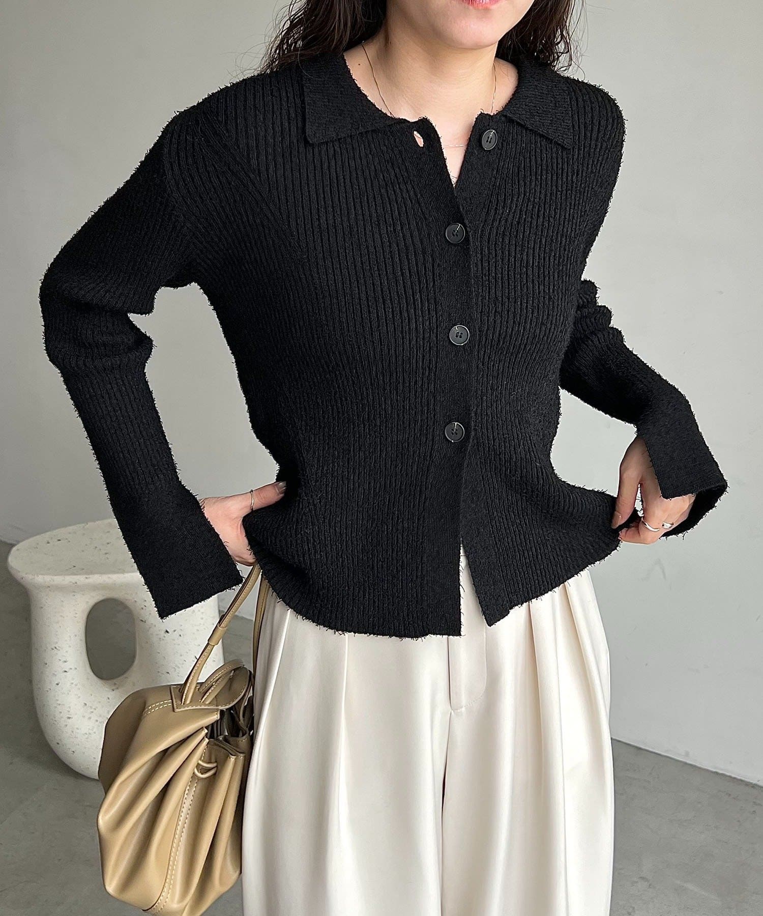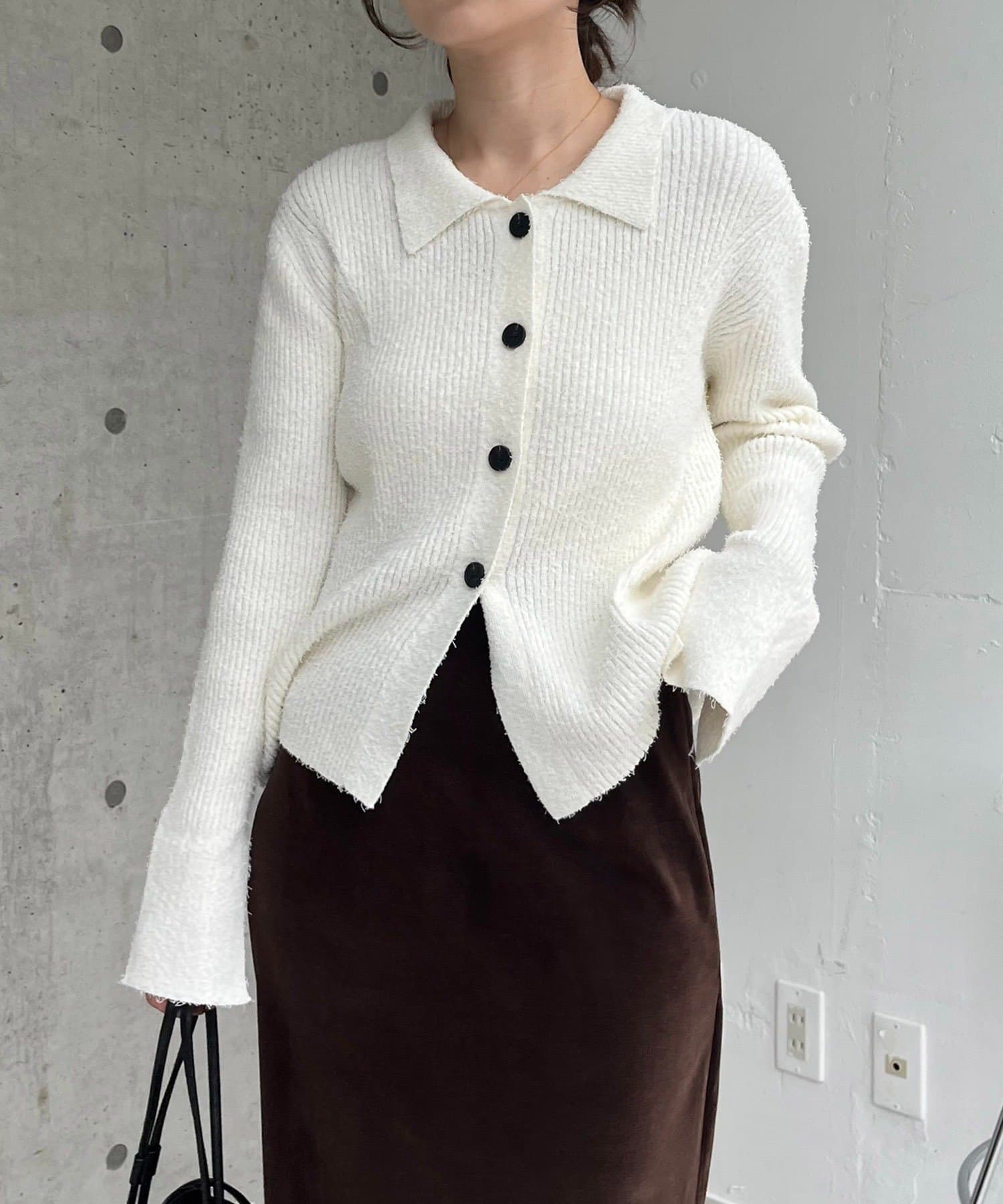 新作のニットが入荷! 細かい毛が全体に編みこまれた襟付きニットで、 コンパクトなサイズ感で着ぶくれせずすっきり着られます♪ 大きめのボタンがアクセントに!