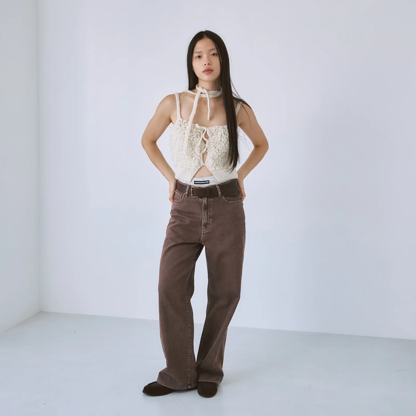 ペルー産ハンドメイドニットならではの太糸を使った優しい表情が特徴のビスチェ。リボンやホール、ロングストラップなどデザイン性たっぷりの1枚。レイヤードができて前後2WAYの万能アイテムです。