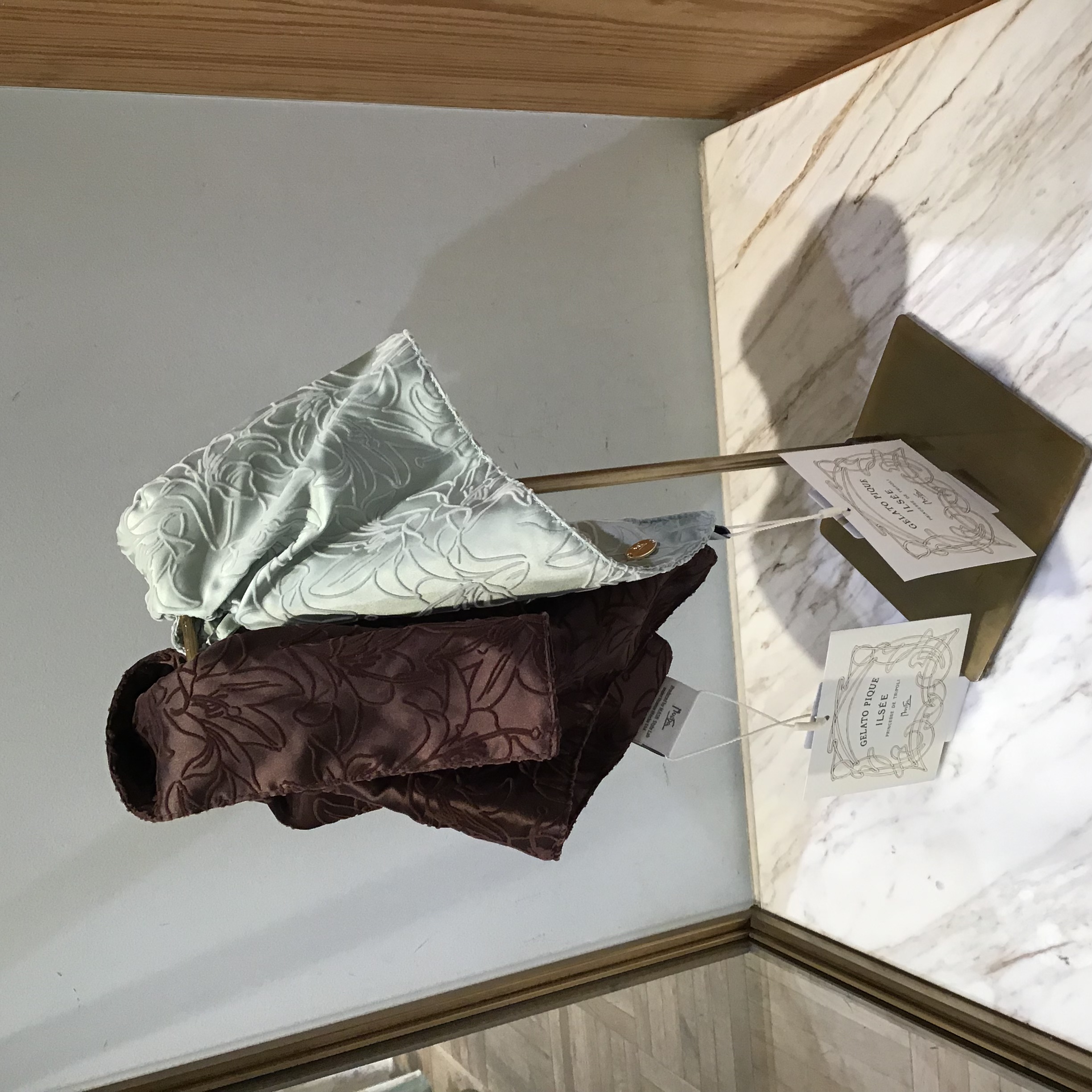 チェコの画家アルフォンス・ミュシャとgelato piqueによる優雅なコレクションが、この秋再び登場しました。今回のテーマは、ミュシャが表紙や挿絵を手がけた切ない恋物語『トリポリの姫君イルゼ』。作中に描かれたリリーの線画を、フロッキープリントで表現したサテン生地のビッグシュシュです。布地をたっぷりと使用しているので、髪を結んだ時にブーケのような上品な華やかさが出ます。ワンポイントでロゴ入りのプレートもあしらいました。色はヴィンテージ感あふれるグリーンとブラウンの2色展開。同シリーズのウェアとコーディネートしたり、雑貨と組み合わせてギフトにもおすすめのアイテムです。