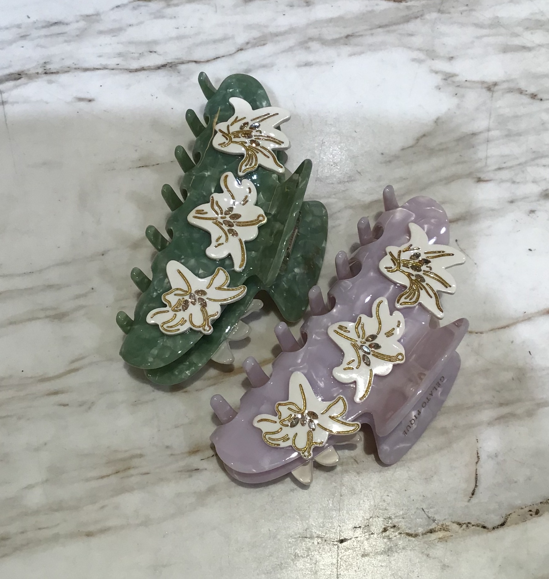 チェコの画家アルフォンス・ミュシャとgelato piqueによる優雅なコレクションが、この秋再び登場しました。今回のテーマは、ミュシャが表紙や挿絵を手がけた切ない恋物語『トリポリの姫君イルゼ』。作中に描かれたリリーをモチーフにした、ロングヘアもしっかり束ねられるヘアクリップです。アセチの立体的なリリーに、繊細な輝きを放つラインストーンをデコレーション。色は同シリーズのベロア×レースのウエアとお揃いの、ラベンダーとグリーンをご用意しました。同シリーズの雑貨と組み合わせたり、ギフトにもおすすめのアイテムです。