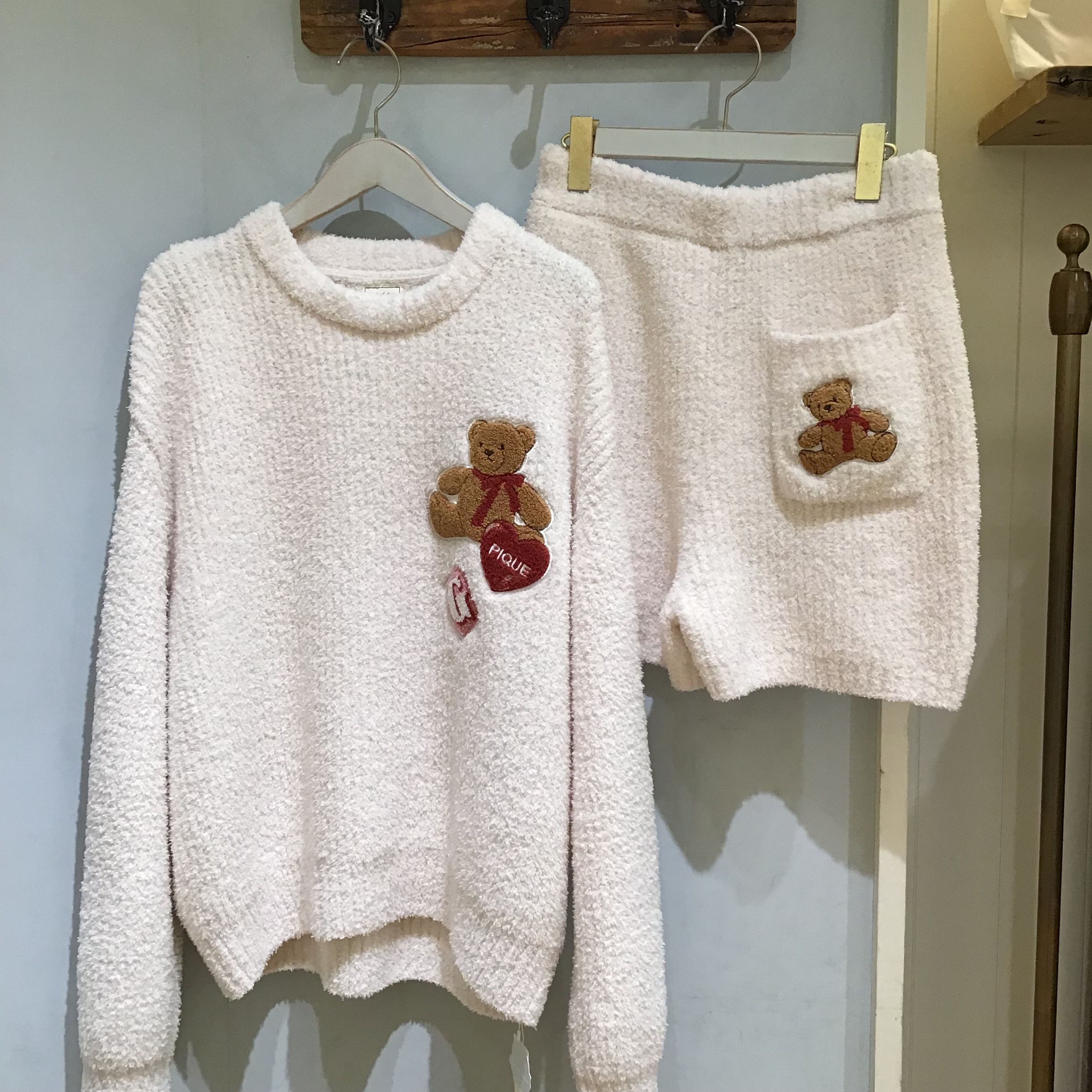 もっちり柔らかい‘ベビモコ’を畦編みにして使用したプルオーバー。胸元にはベアのぬいぐるみとハートのクッション、雑誌から切り抜いたような『G』のサガラ刺繍が入っています。身幅はゆったりとさせつつも、やや短めの丈感でトレンドライクに着こなせるシルエット。ショートパンツは左腰にロゴ刺繍を入れ、後ろポケットにはベアのぬいぐるみをモチーフにしたサガラ刺繍が入っています。裾にリブを入れ、すっきりとコンパクトなシルエットで仕上げました。色はアイボリー、ピンク、ネイビーの3色展開です。