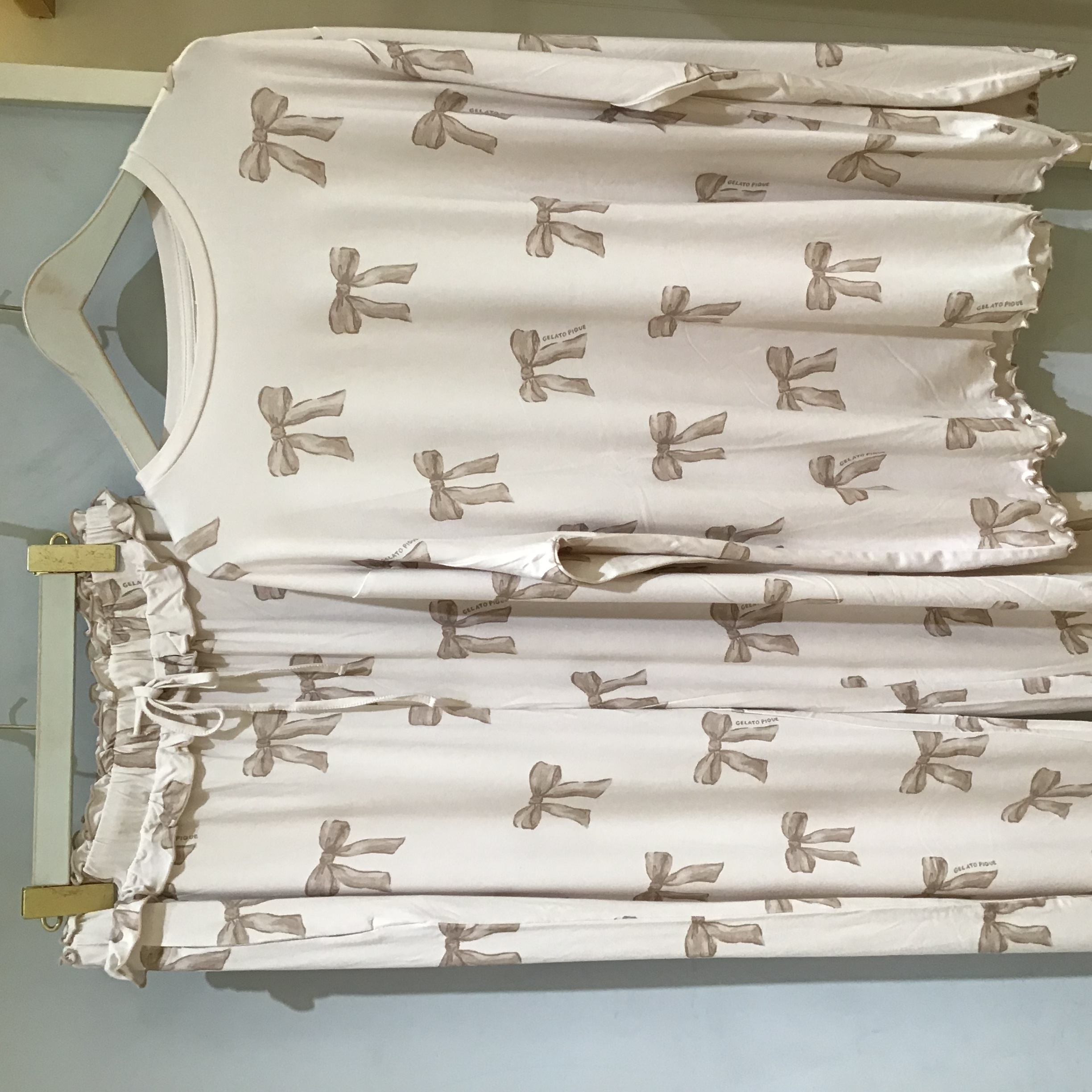 季節感のあるこっくりとしたタッチで描いたリボンを、総柄プリントしたカットソーシリーズです。