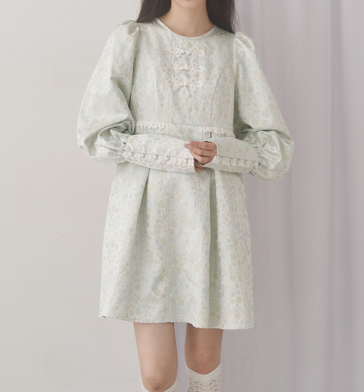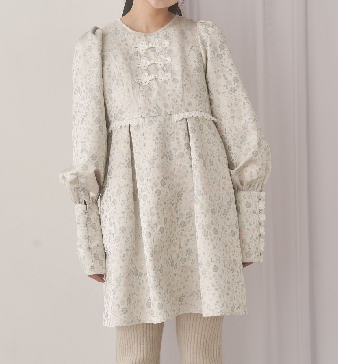 柔らかいパステルカラーの花柄ジャガードを使用したチャイナボタンミニワンピース。