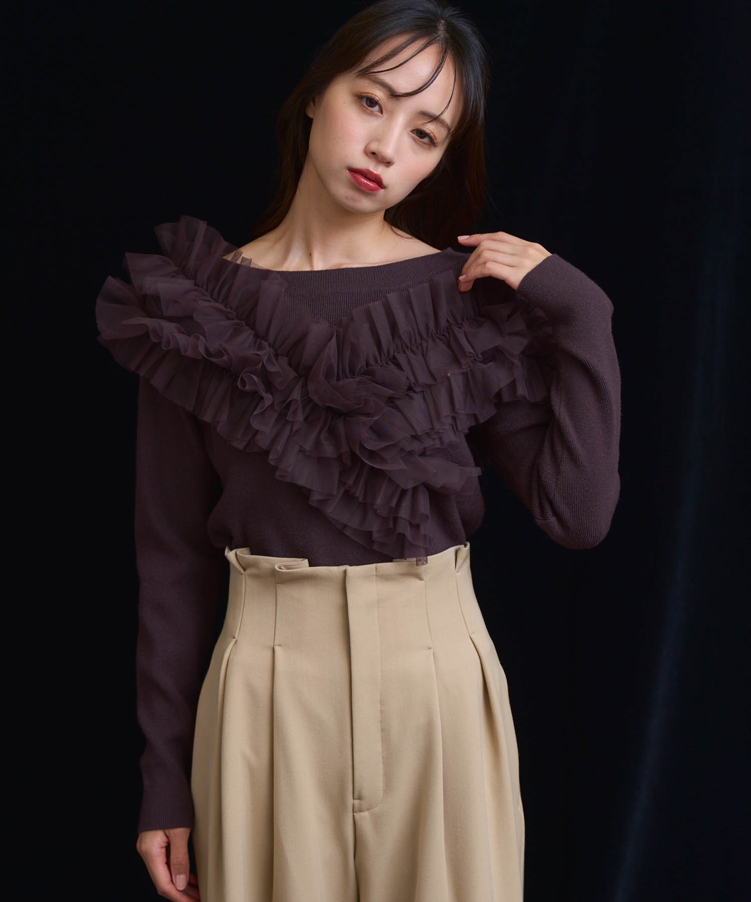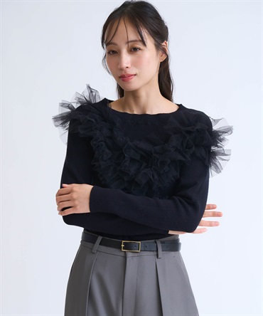 アシンメトリーにあしらったチュールフリルが目を引く、デザイン性の高いリブニット。
