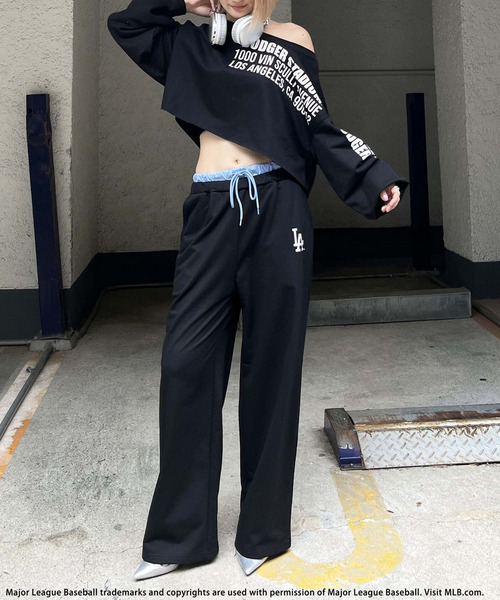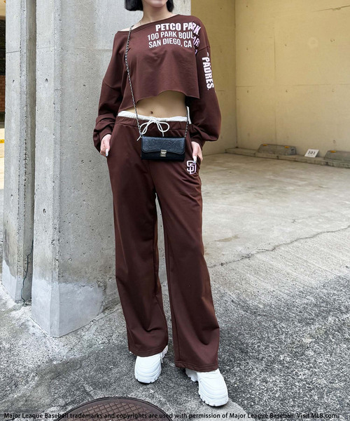トレンド感あふれるオフショルダー仕様のトップスと、脚を長く見せるルーズなパンツを組み合わせた注目のセットアップ。