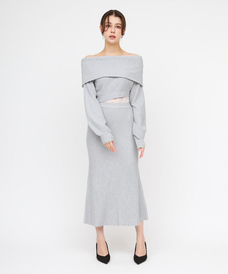 肩を落としたオフショルデザインで、デコルテを美しく魅せながら、ウエストには大胆な肌見せ。
