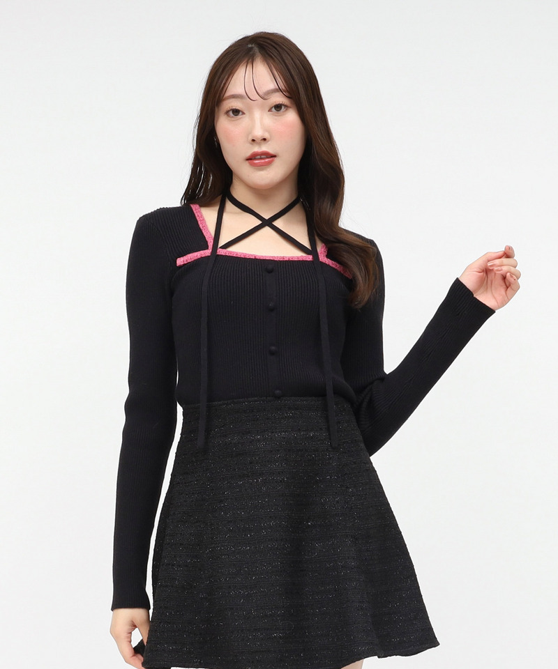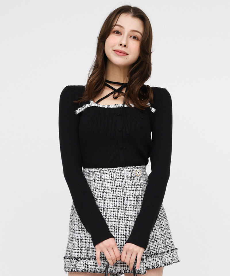 ツイードパイピングリボンニットトップス