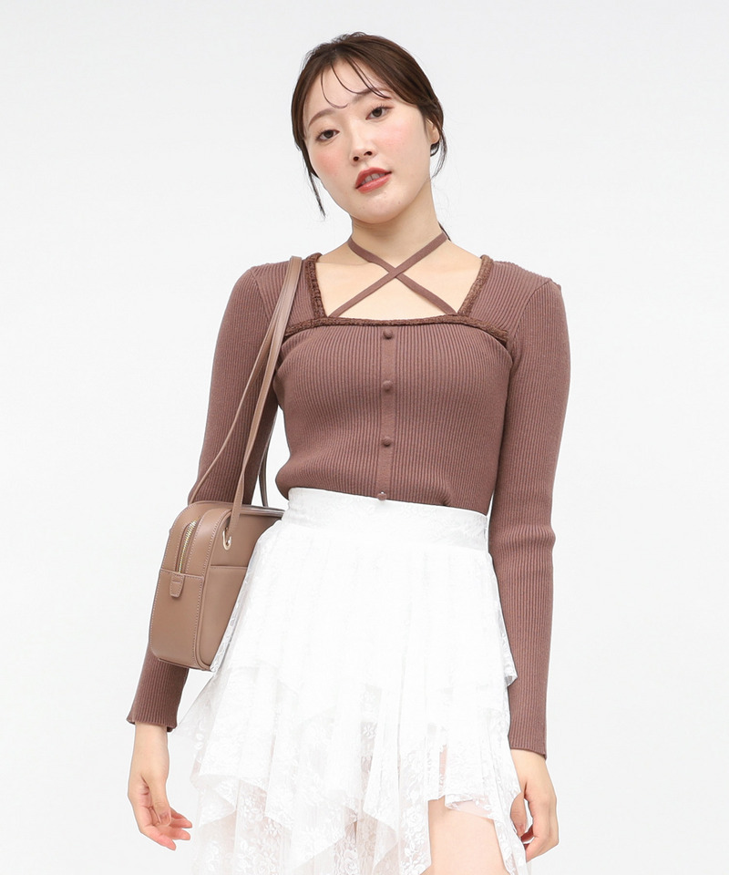 首元の細紐はフロントでクロスしリボンを結んだり前に垂らしたりと様々なアレンジをお楽しみいただけます。