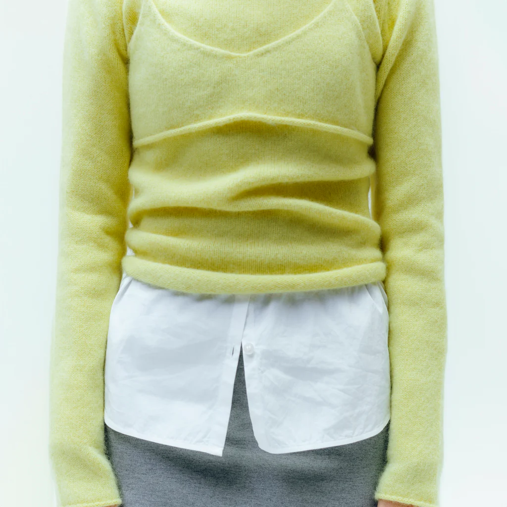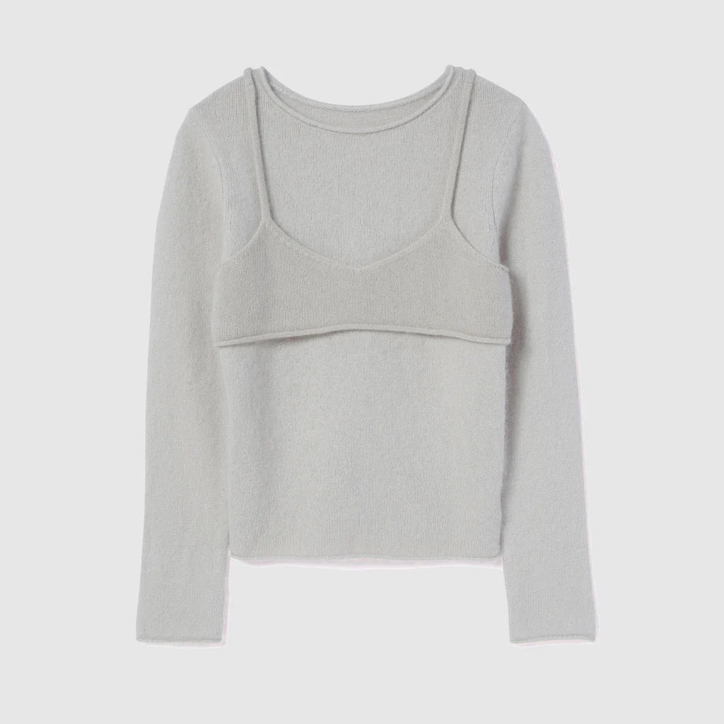重ね着がキーワードとなっている今年にぴったりの、トップスとビスチェのセット。アンゴラ、ウール、ラクーンの糸をブレンドした上質ニットを使用しています。