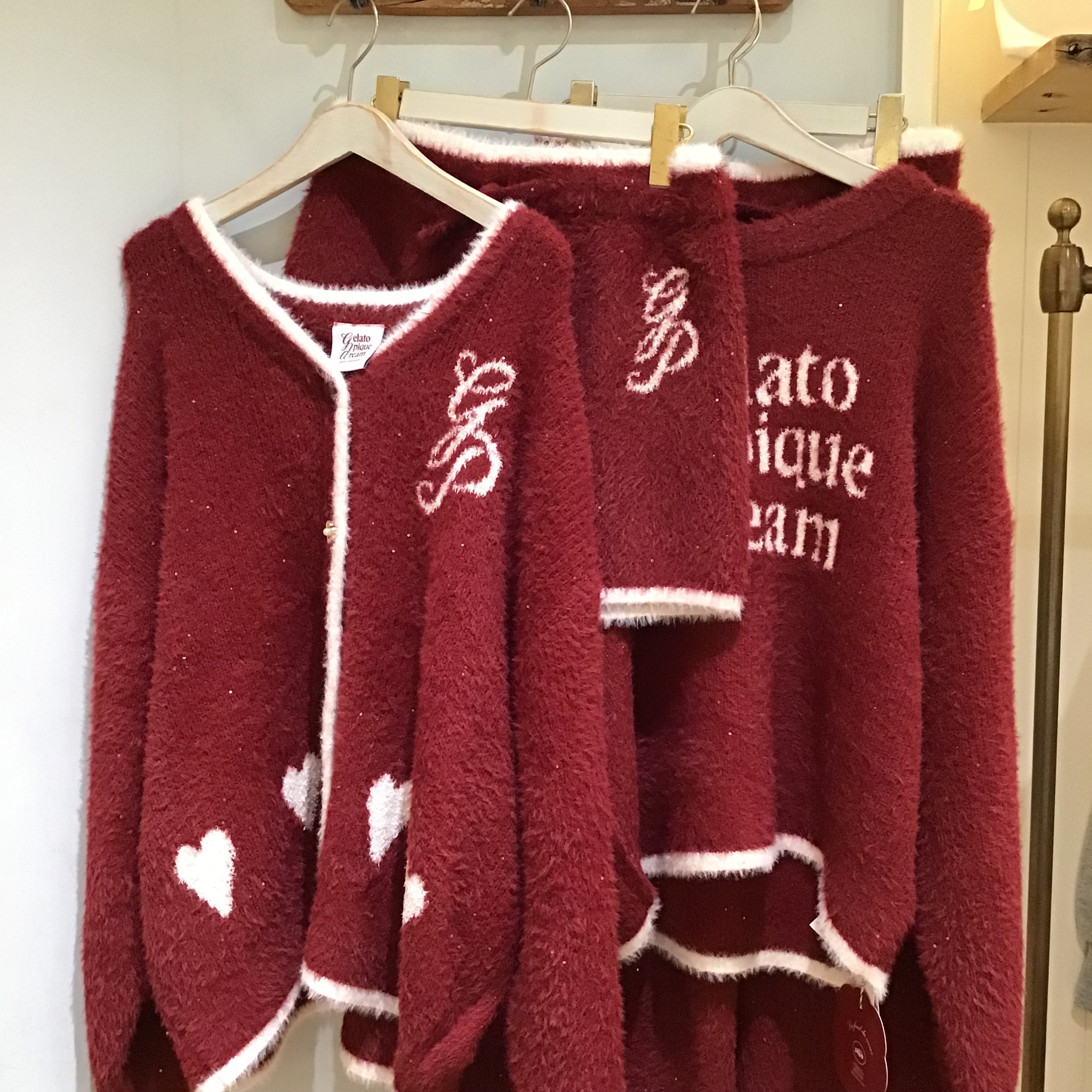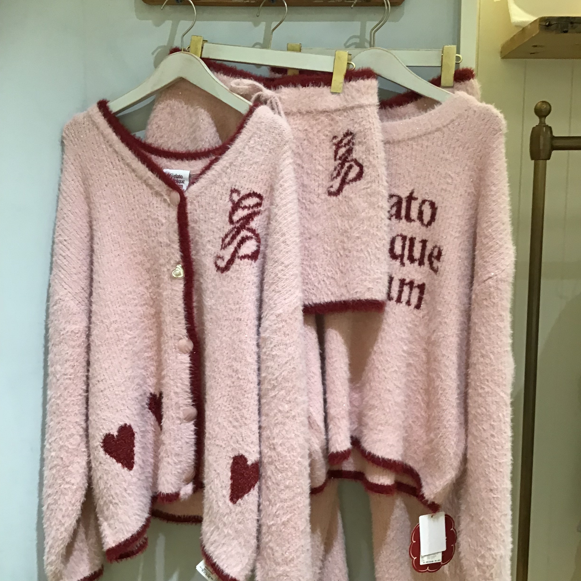 毛足が長く、ふんわりと軽やかな着心地のカーディガンは、背中に大きく入れたロゴジャガードがポイント。フロントにもハートやエンブレムロゴ、袖口や裾に配色デザインを施して、キュートな存在感に仕上げました。腰回りをカバーするゆったりとしたシルエットも魅力です。色はカラフルなライトブルー、ピンク、レッドの3色展開。同シリーズのショートパンツやロングパンツと合わせたり、同時期のレースサテンシリーズとの組み合わせもおすすめです🎶