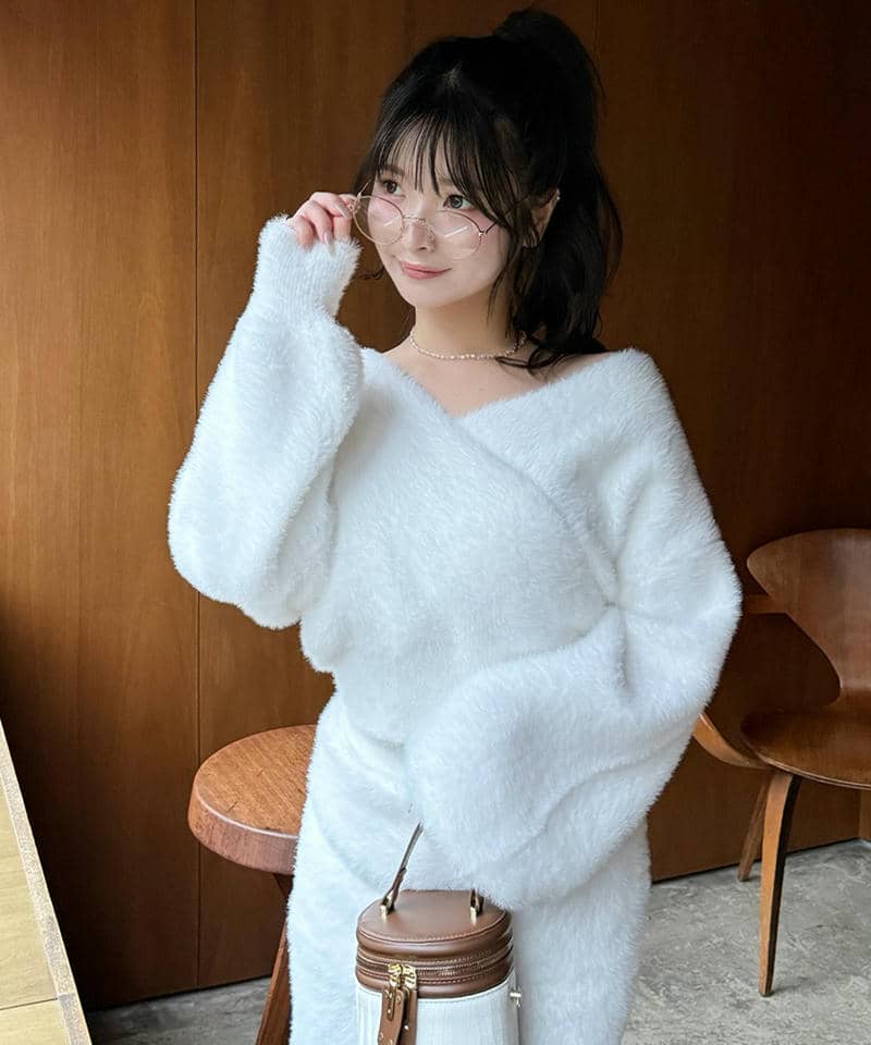 ふんわりとしたシャギーニットで仕立てたカシュクールデザインのトップス。