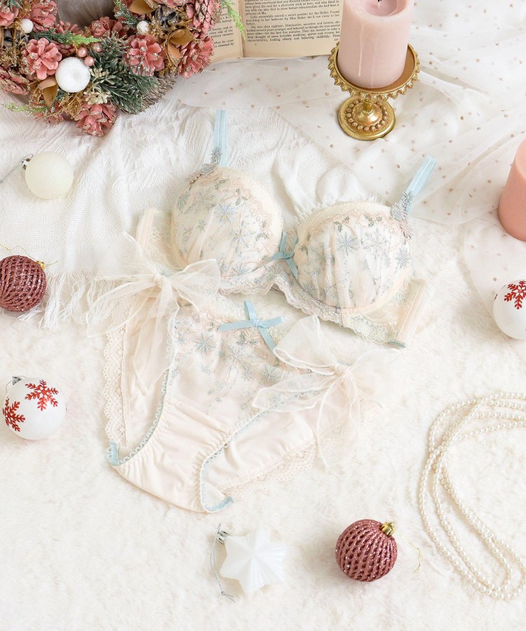 キラキラと揺れるオーナメントをモチーフにした、リサマリのクリスマスコレクションです。レースには窓辺に飾られているリボンやモミの木、ベルや鈴をふんだんに刺繍して、オーナメントがゆらゆらと揺れている様子を可愛らしく表現。窓の外に降り積もる雪の結晶を、たっぷりのラメ糸で豪華にあしらいました。カップ上辺はシンプルなレースで2段になるよう切り替えて、刺繍1つ1つを引き立たせるナチュラルな上品さを演出。ストラップにもオーナメントをイメージしたアップリケを添えて、ホリデー気分高まる特別感をプラスしています。年に1度のクリスマスシーズンは、Risa Magliのランジェリーでヒロインに。心ときめく素敵なひと時をお過ごしください。