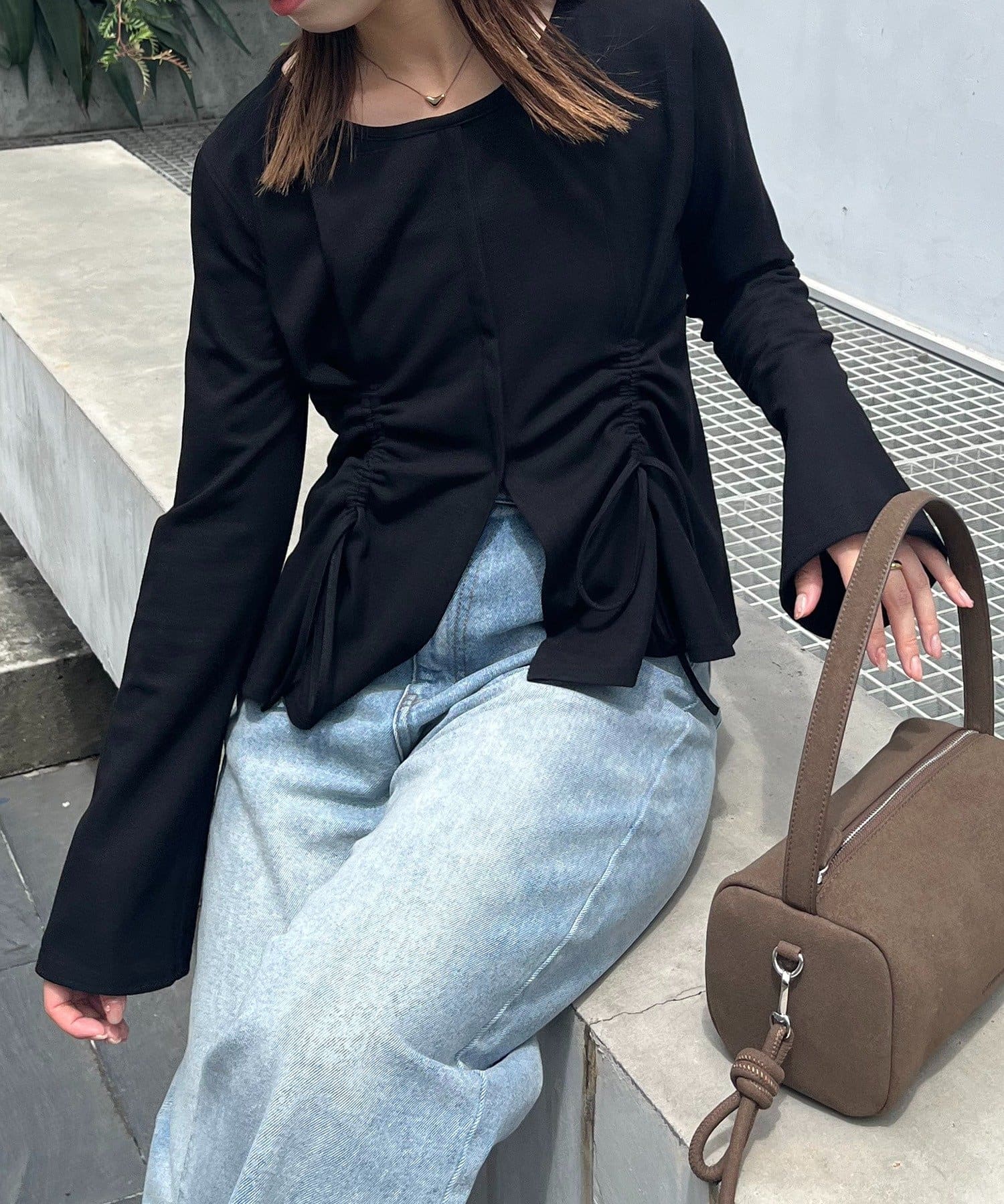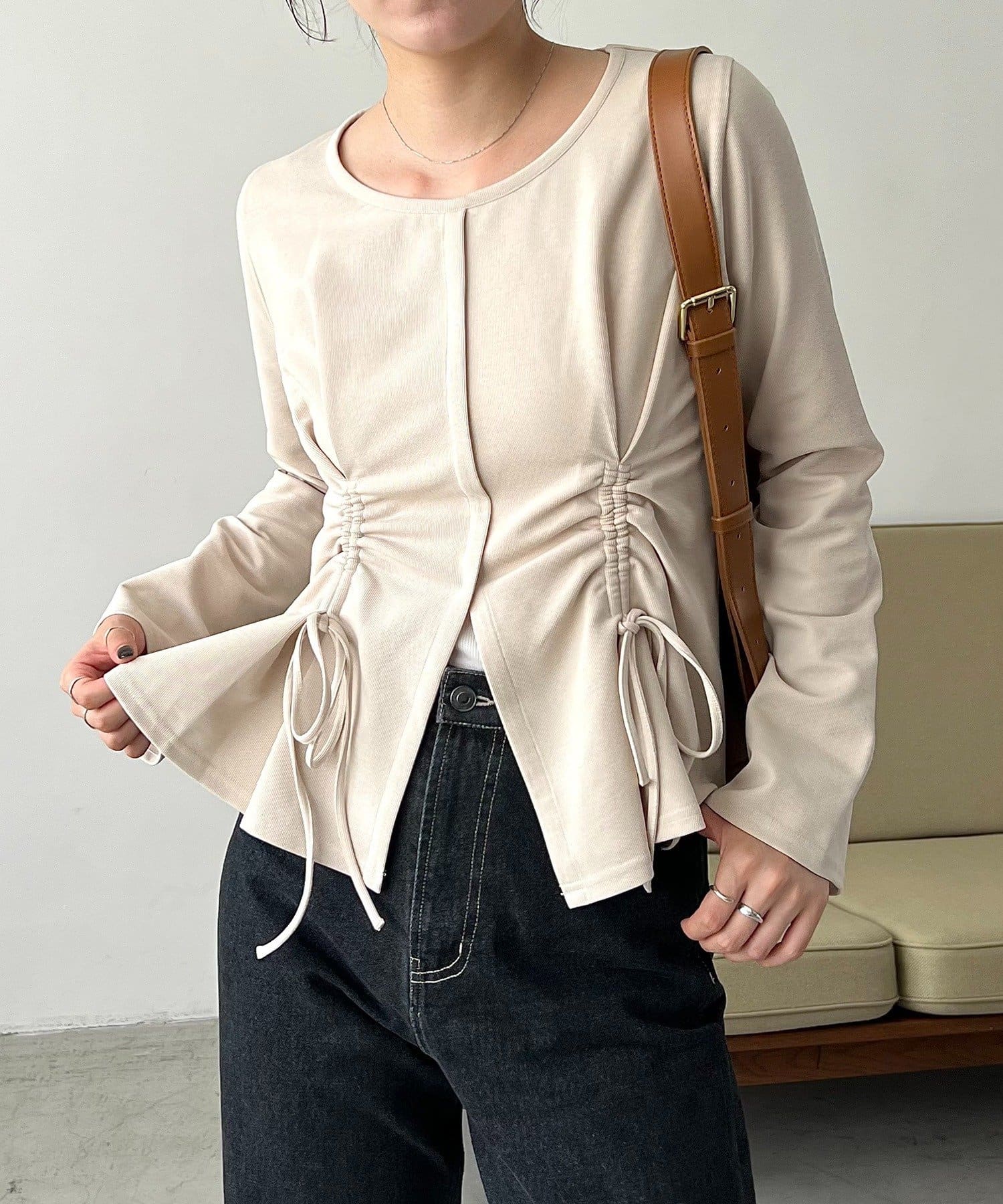 今の時期に欲しいロンT。 ドロストリボンのデザインが他にはないアイテム♡ 自然とくびれてくれるデザインで細見え効果抜群! ジャケットやアウターも着やすく、楽ちんカットソーです!
