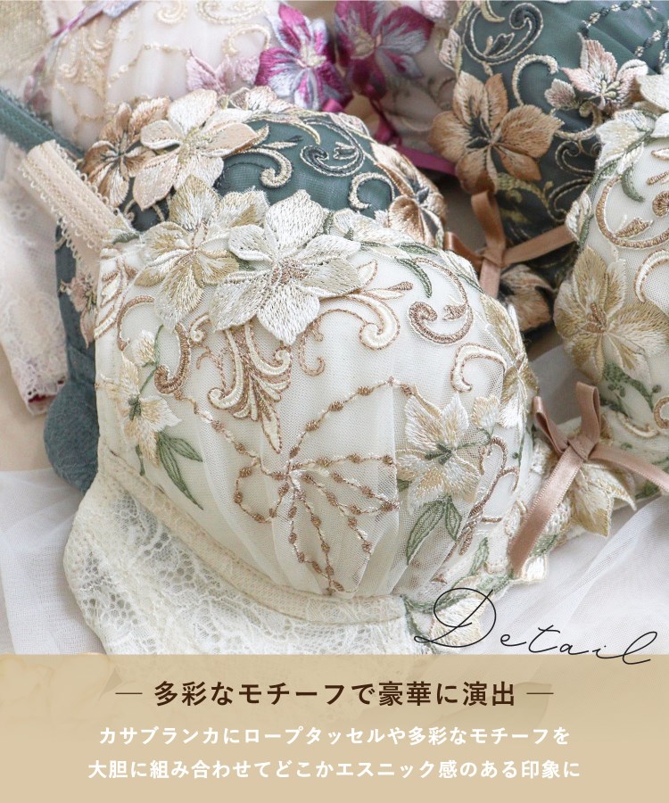 ユリの女王、カサブランカのお花をイメージしたシリーズです。カサブランカをモチーフにしたインパクトのあるお花は、密度のあるステッチで美しい光沢感を演出。ロープタッセルのようなドット柄のリボンや、多彩なモチーフを大胆に組み合わせて、どこかエスニック感のある印象に仕上がりました。その上からカサブランカのアップリケを重ねることで、カップのエンブレースとは異なるカラーリングが加わり、お花1つ1つが引き立つ豪華で奥行きのあるデザインに。ラメ糸の輝きとカサブランカの高貴な気品あふれる世界観が、思わず目をひくコレクションです。